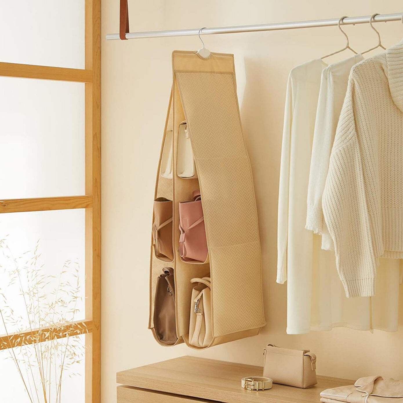 Dekoratif ve modern görünümüyle 6 bölmeli asılabilir çanta düzenleyici, tasarımı ile çantalarınızı rahatça görmenizi sağlarken aynı zamanda çantalarınızı korur.