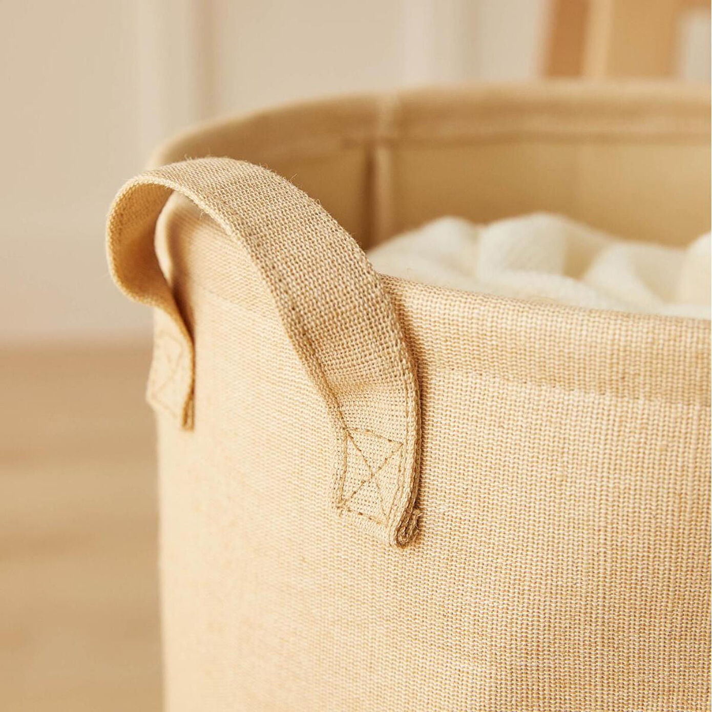 Çocuk odaları için tasarladığımız sepetin kumaşı, tamamen jüt ve pamuk ipliklerden dokunmuş olup, doğal ve estetik bir görünüm sunar. Jüt iplik, doğal liflerden elde edilir ve doğada biyolojik olarak çözünebilir. Pamuk iplik ise yumuşak ve dayanıklılık özellikleri ile öne çıkmaktadır. Doğal iplikler kullanılarak üretilen sepet, sürdürülebilirlik bilincini destekler. İlham verici oyun alanları sunan oyuncak sepeti, çocuk ve bebeklerin odalarında düzeni sağlamak, depolama alanlarını en iyi şekilde kullanmak, oyuncakları, kıyafetleri ve diğer eşyaları organize etmek için tasarlanmıştır.