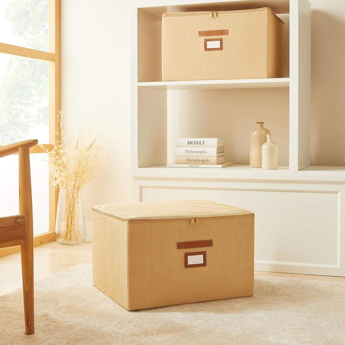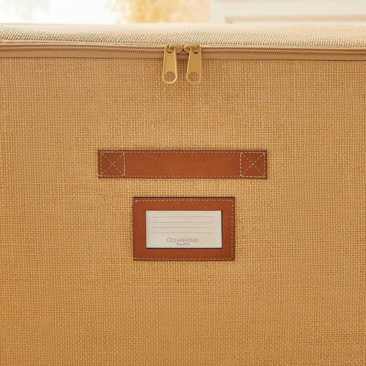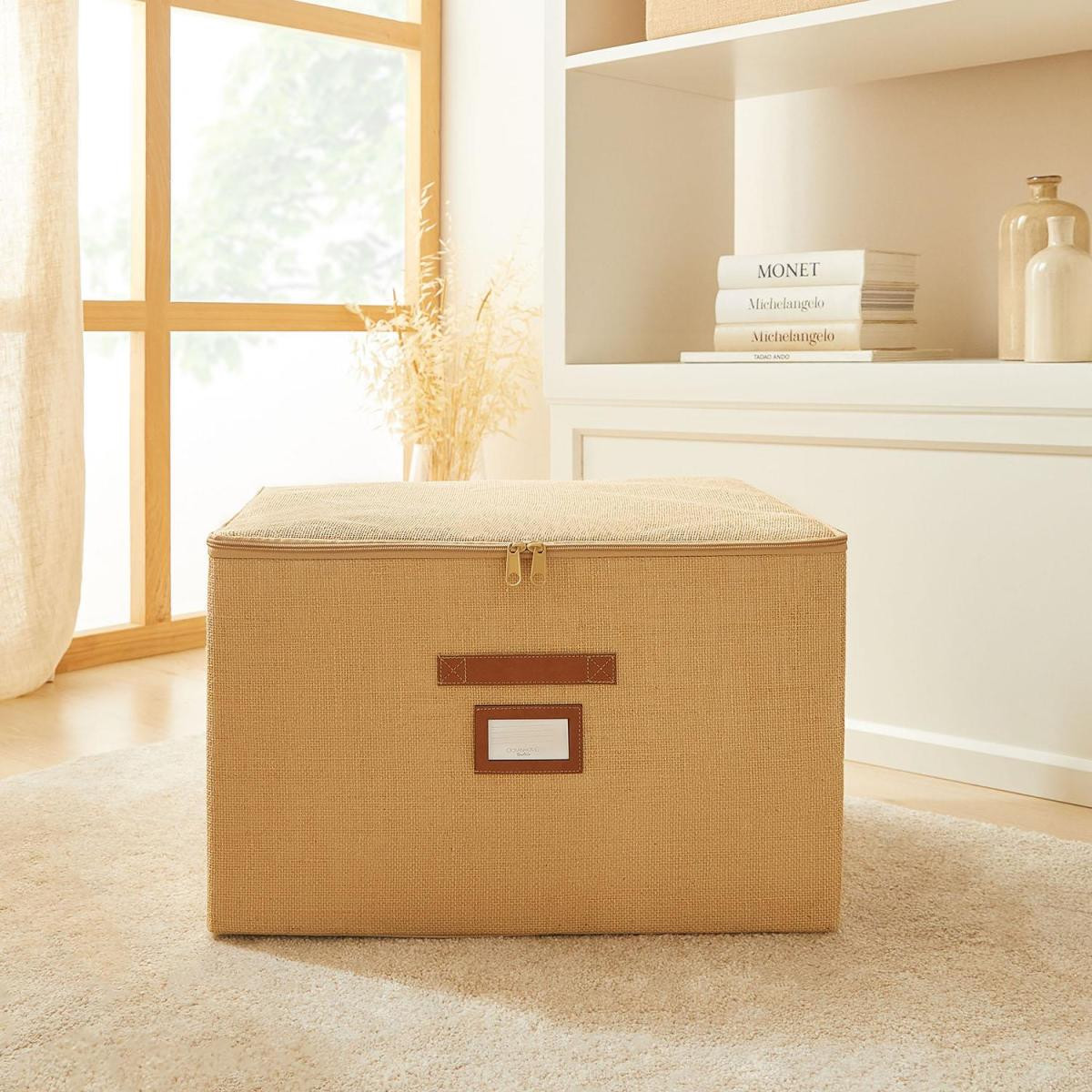 Jüt destekli kutu hurcun ön yüzeyinde bulunan deri görünümlü etiket koyma bölmesi sayesinde içerisine yerleştirilen eşyaları kolayca tanımlayabilirsiniz.