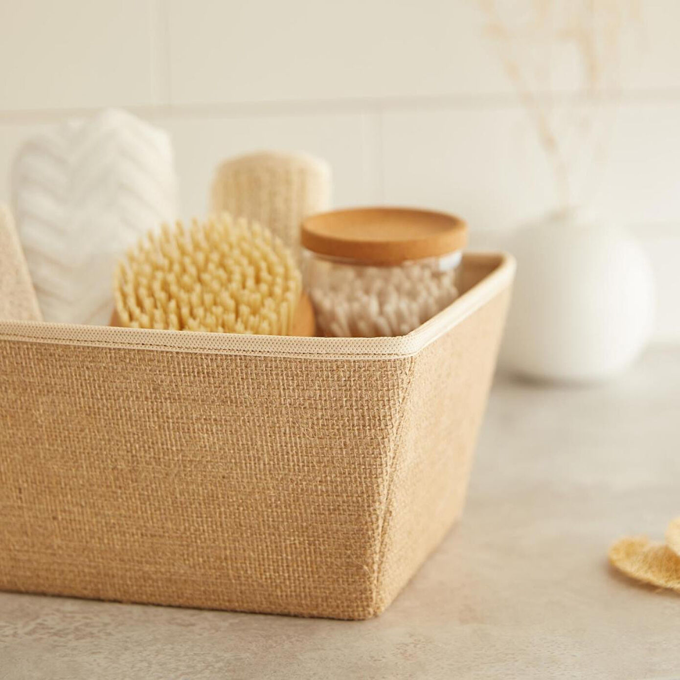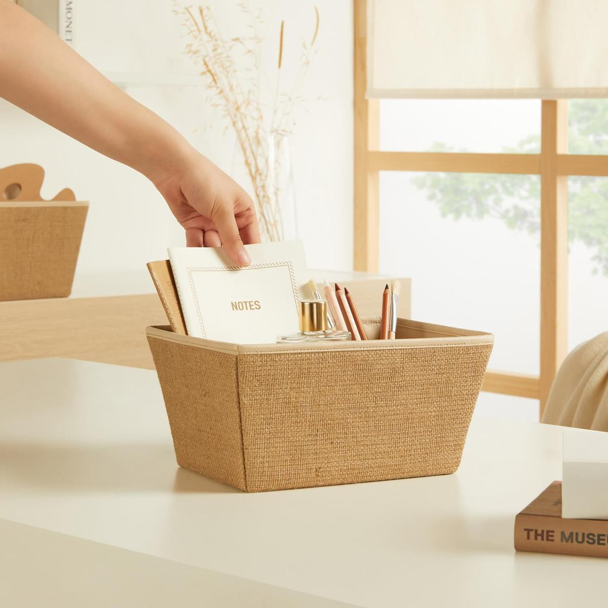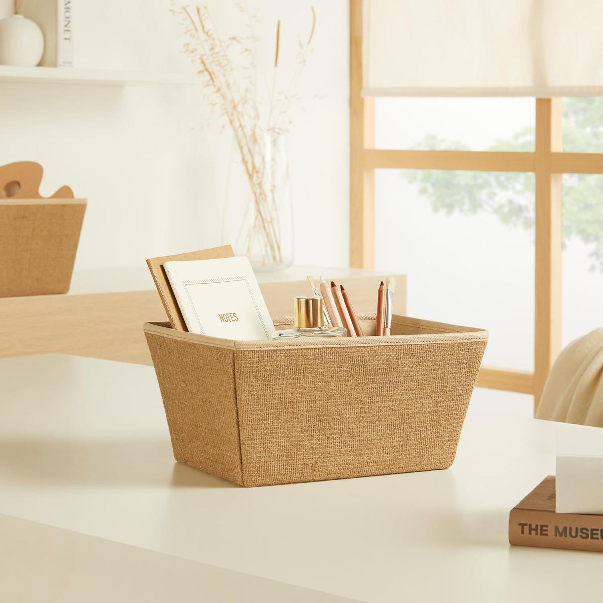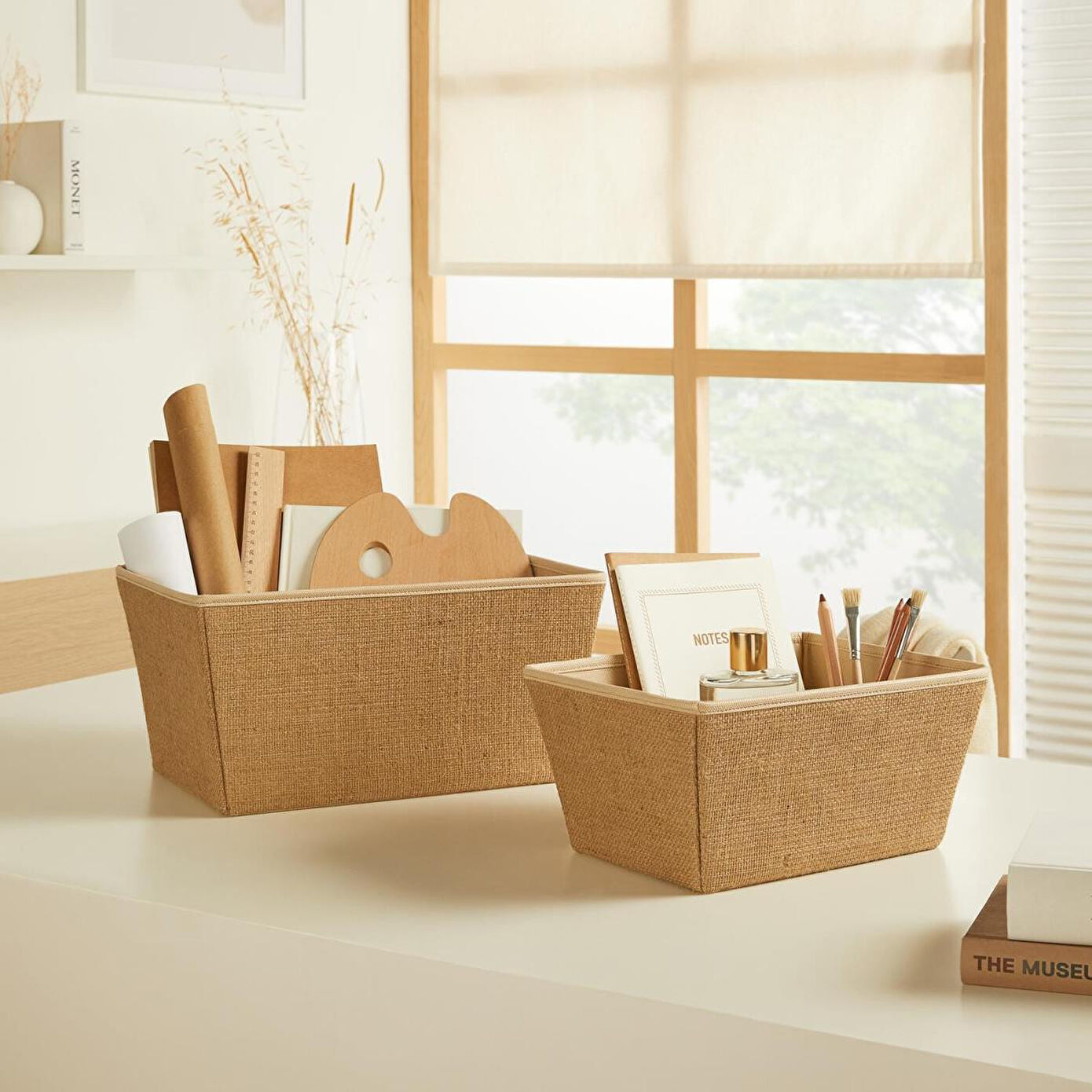 Jüt kumaştan üretilmiş kutu, düzenli alan oluşturmanıza yardımcı olurken farklı tasarımıyla bulunduğu ortama şıklık katar.