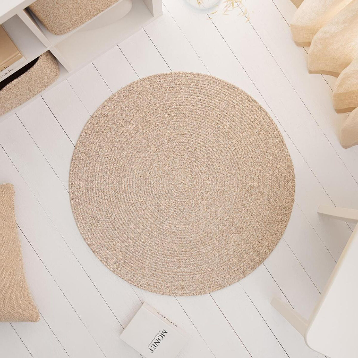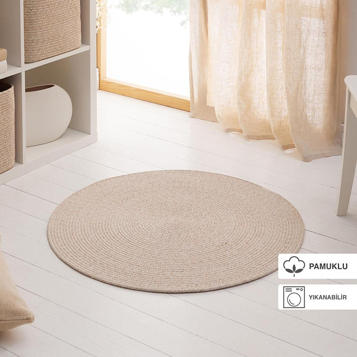 Ocean Home Textile Yıkanabilir Bej Kırçıllı Pamuklu Halı Kilim Ø 80 Cm