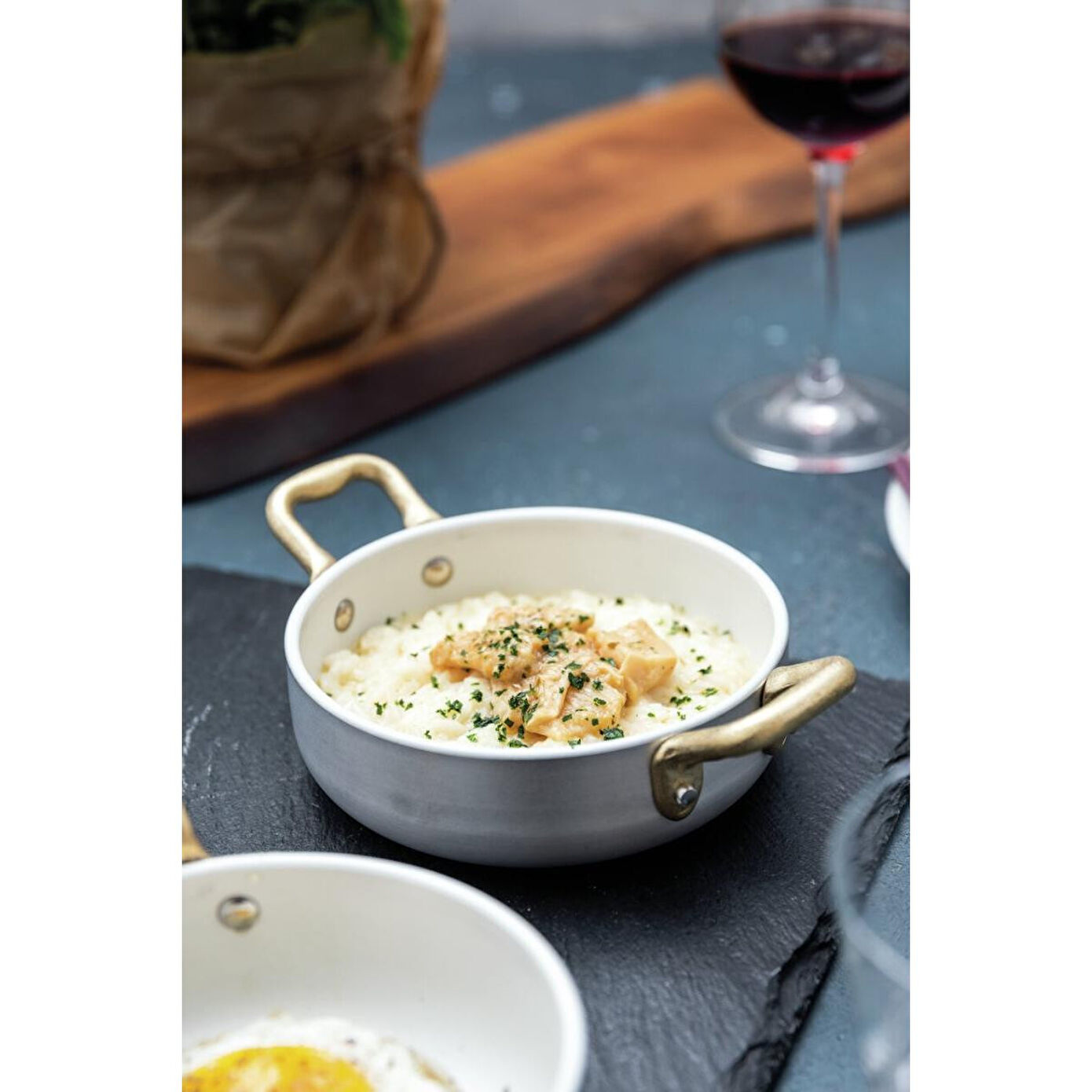 Alüminyum gövde, seramik yapışmaz iç kaplama, pirinç kulp ve perçinler, 3mm kalınlığında ürünler. Ateşte kullanılır. Seramik ve elektrikli ocaklara uygun tasarlanmıştır. Elde yıkama tavsiye edilir. 12 cm. Menşei: İtalya.