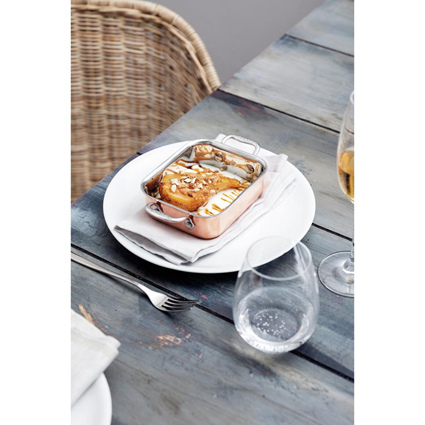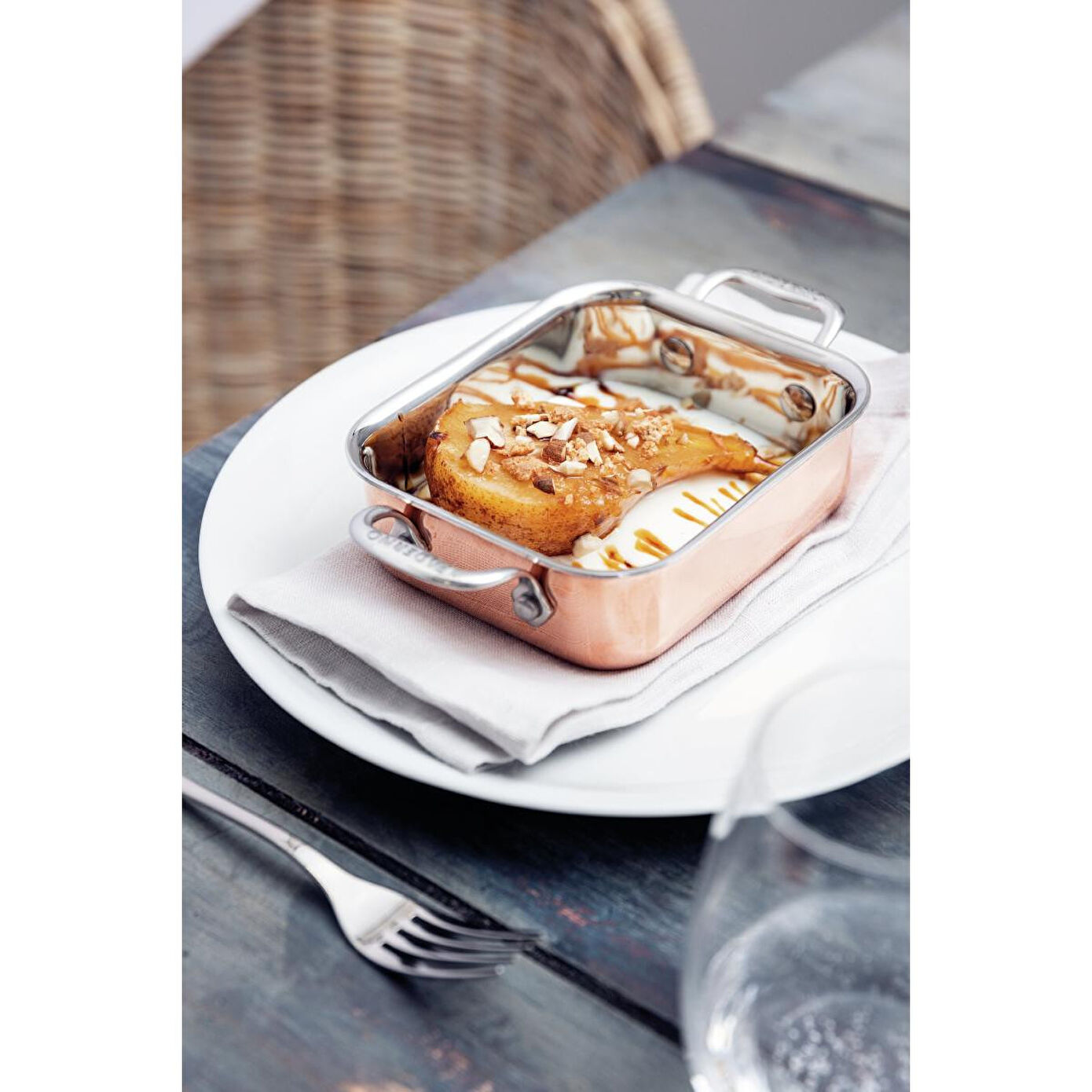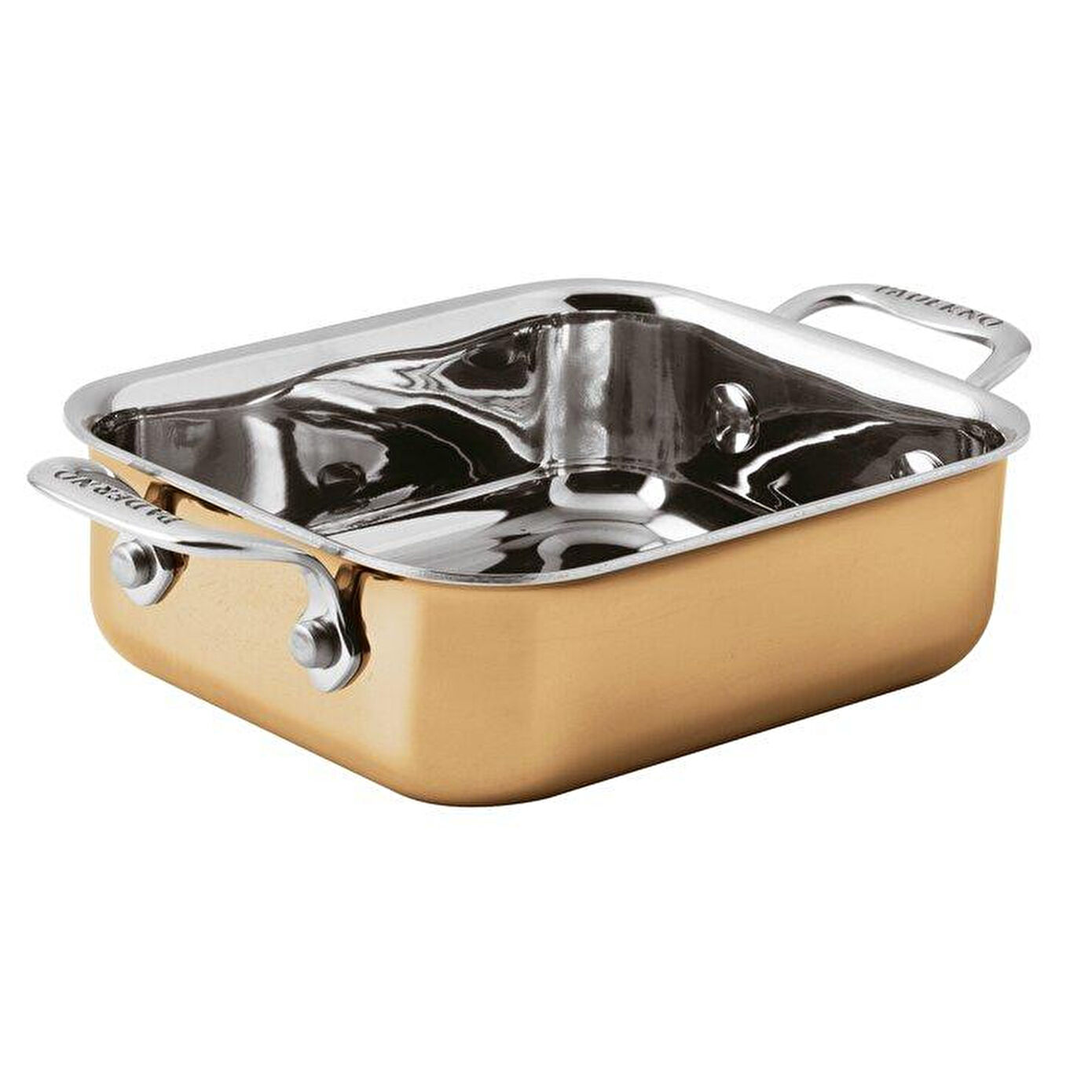 12X10 Cm. Yükseklik 4cm. 3 Katmanlı, içi paslanmaz çelik saten cilalı, alüminyum katmanlı, dışı bakır ayna kaplamalı, 2 mm kalınlığında ürünlerdir. Kulp ve perçinleri paslanmaz çelik dökümdür. İndüksiyonlu ocaklar hariç her türlü ısıda kullanılır. Menşei: İtalya