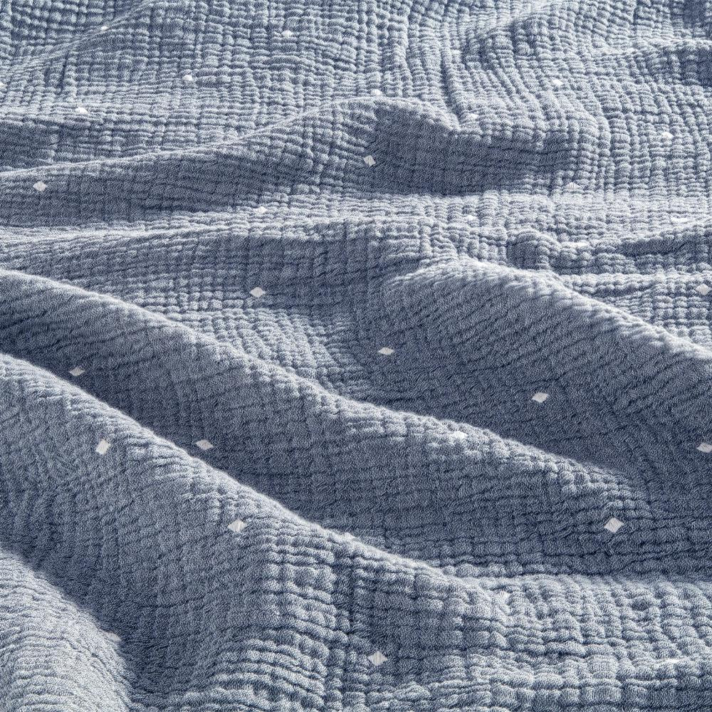 %100 Pamuk Müslin Kumaş: Doğal elyaf yapısı sayesinde terletmez, hava geçirgenliği sayesinde dört mevsim kullanıma uygundur.Katmanlı Hafif Doku: Kumaşın ince yapısı katmanlarla zenginleştirilmiş olup, yumuşak dokusuyla konfor sunar. Hafif buruşuk görünüm modern ve doğal bir estetik kazandırır.Nakış Detayları: Örtü üzerinde yer alan küçük, tonlarına göre nakış detayları sade bir görünüm sunar.Kolay Bakım: Müslin kumaş çabuk kurur, doğal kırışıklığı sayesinde ütü gerektirmez.Ölçüler: 160x240 cm, 220x240 cmRenk Seçenekleri: Mavi, Gri, Yeşil, Bej.Ürün Bilgileri