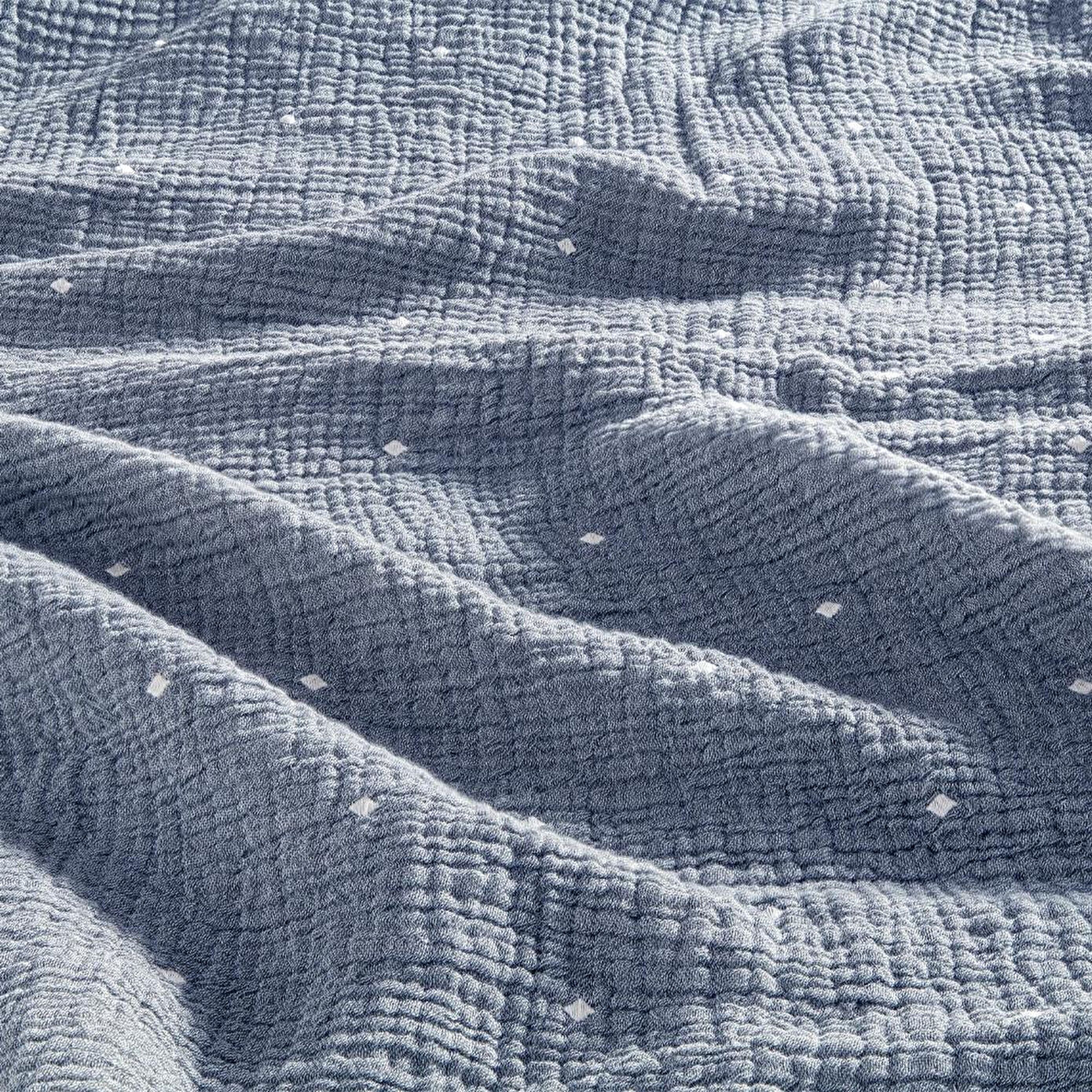 %100 Pamuk Müslin Kumaş: Doğal elyaf yapısı sayesinde terletmez, hava geçirgenliği sayesinde dört mevsim kullanıma uygundur.Katmanlı Hafif Doku: Kumaşın ince yapısı katmanlarla zenginleştirilmiş olup, yumuşak dokusuyla konfor sunar. Hafif buruşuk görünüm modern ve doğal bir estetik kazandırır.Nakış Detayları: Örtü üzerinde yer alan küçük, tonlarına göre nakış detayları sade bir görünüm sunar.Kolay Bakım: Müslin kumaş çabuk kurur, doğal kırışıklığı sayesinde ütü gerektirmez.Ölçüler: 160x240 cm, 220x240 cmRenk Seçenekleri: Mavi, Gri, Yeşil, Bej.Ürün Özellikleri