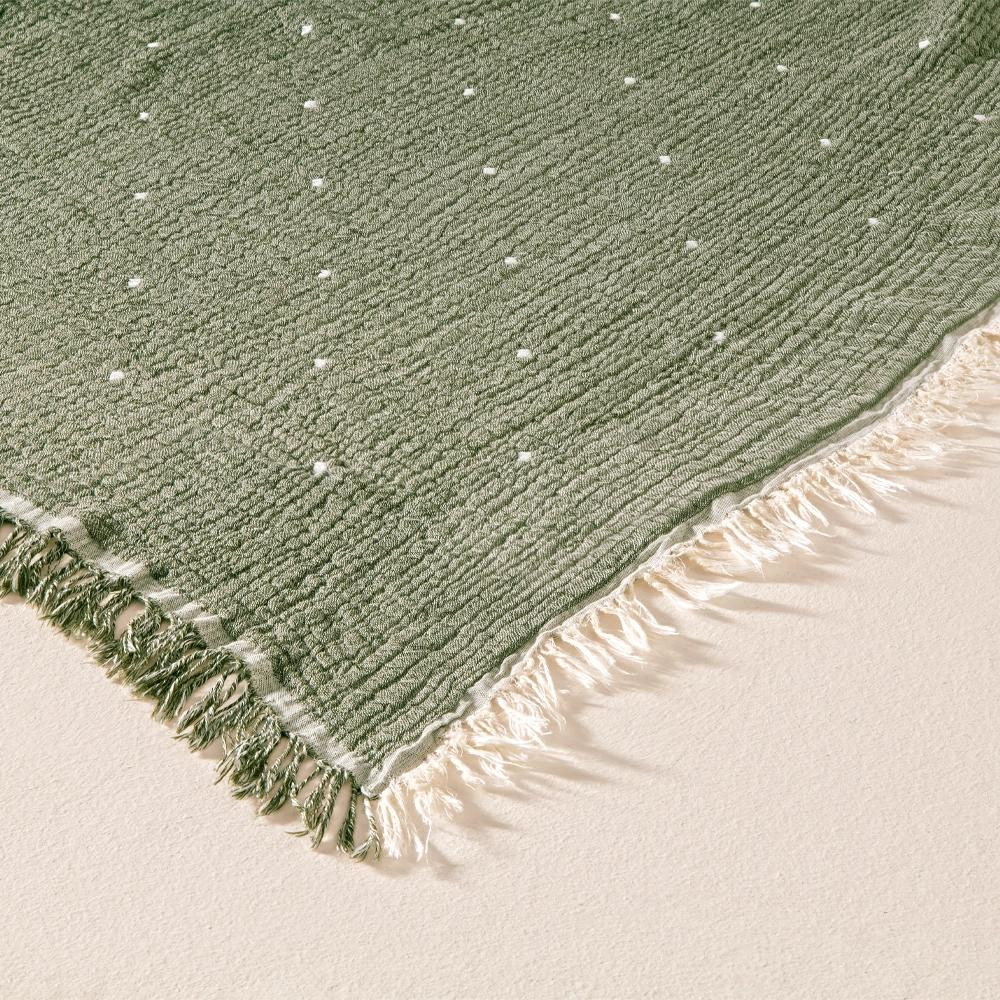 %100 Pamuk Müslin Kumaş: Doğal elyaf yapısı sayesinde terletmez, hava geçirgenliği sayesinde dört mevsim kullanıma uygundur.Katmanlı Hafif Doku: Kumaşın ince yapısı katmanlarla zenginleştirilmiş olup, yumuşak dokusuyla konfor sunar. Hafif buruşuk görünüm modern ve doğal bir estetik kazandırır.Nakış Detayları: Örtü üzerinde yer alan küçük, tonlarına göre nakış detayları sade bir görünüm sunar.Kolay Bakım: Müslin kumaş çabuk kurur, doğal kırışıklığı sayesinde ütü gerektirmez.Ölçüler: 160x240 cm, 220x240 cmRenk Seçenekleri: Mavi, Gri, Yeşil, Bej.Ürün Özellikleri