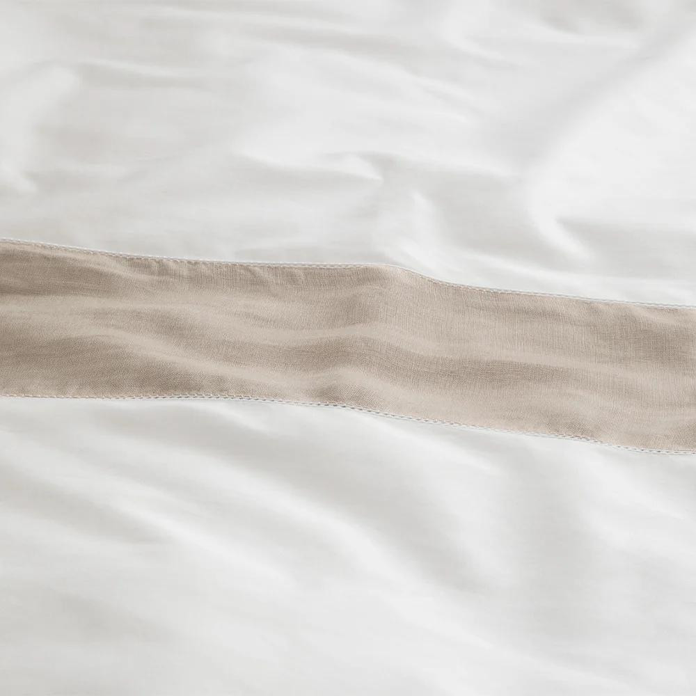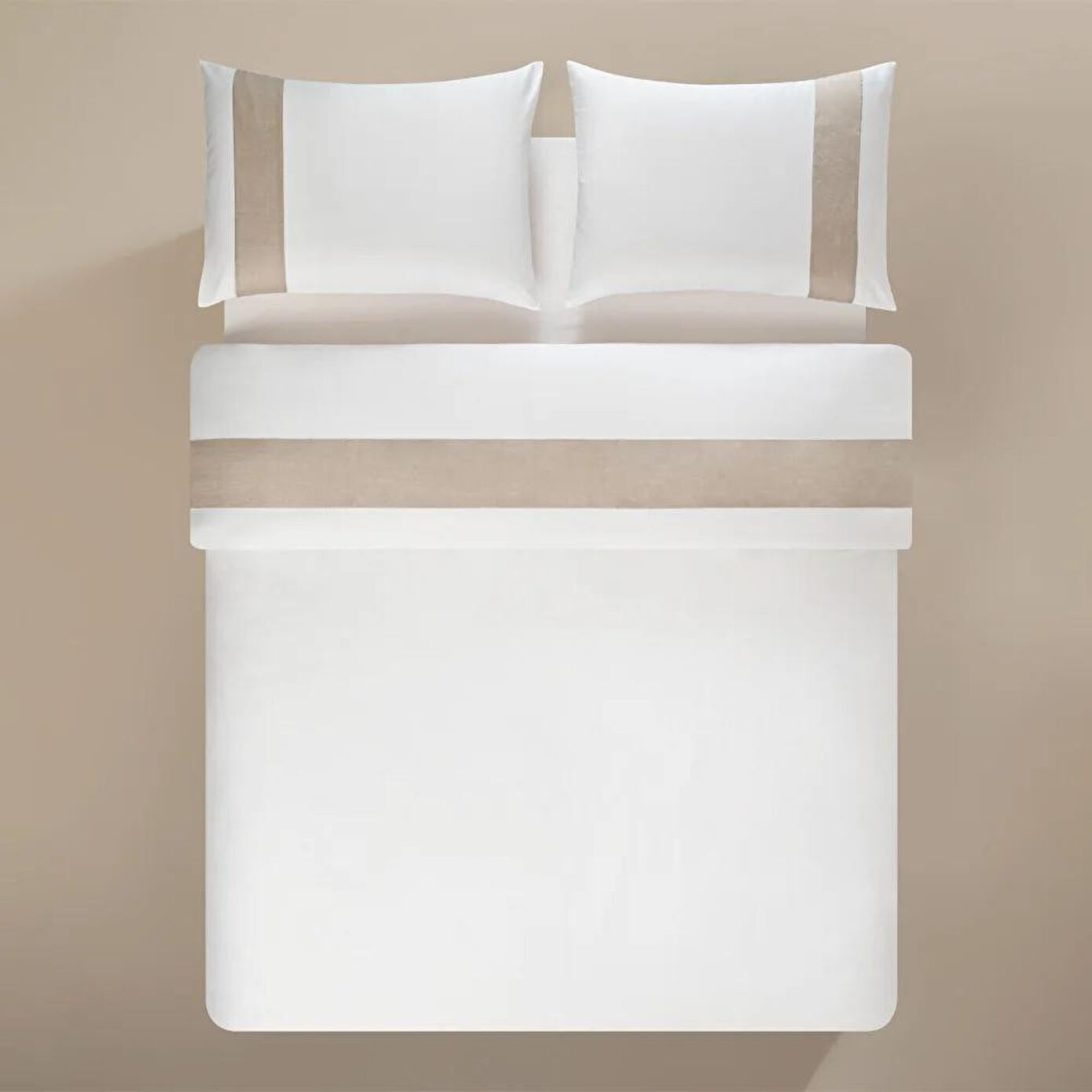 Luciano Nevresim Seti, 300 TC (120 tel) pamuk saten dokusu ve keten parça detaylarıyla yatak odanıza hem doğal bir his hem de zarif bir estetik katar.
