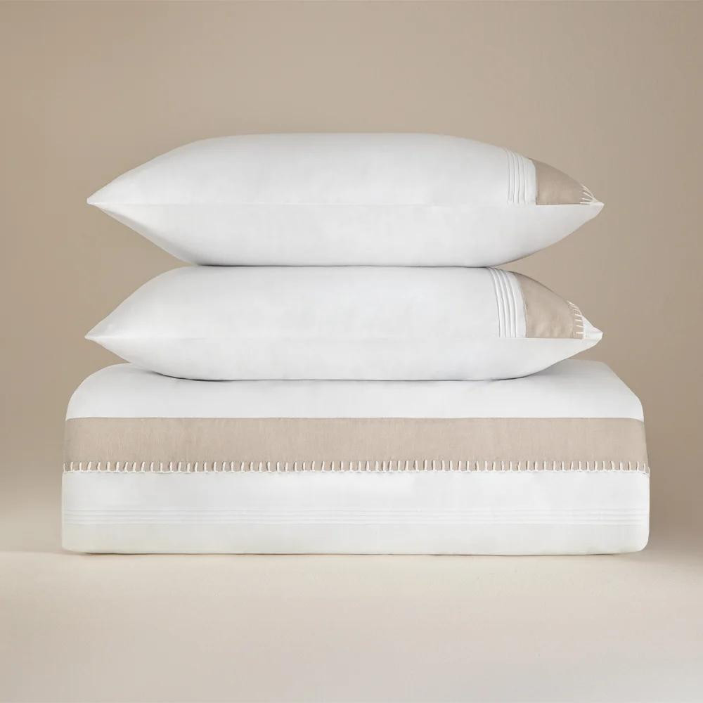 Günlük kullanımda aradığınız konforu ve zamansız şıklığı bir araya getirir. 300 TC (thread count) / 120 tel yoğunluğundaki pamuk saten kumaşı, ipeksi yumuşaklık ve pürüzsüz bir yüzey sunarken, kaliteli uyku deneyimini üst seviyeye taşır. Nevresim üzerine eklenen doğal keten parça ve özenli çoban dikişi detayı, sete modern ve sofistike bir karakter kazandırır; yatak odanızda sade ama etkileyici bir atmosfer yaratır.