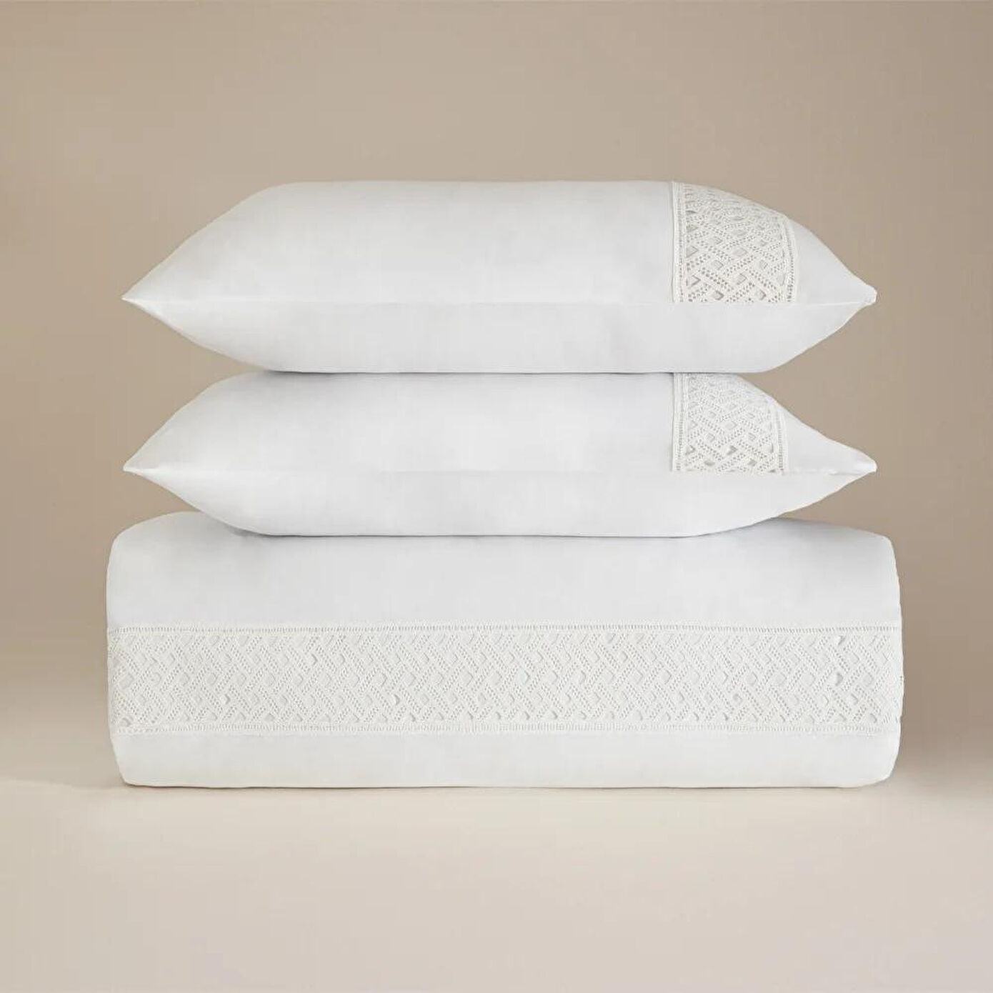 Yumuşacık temas hissi ve ipeksi parlaklığıyla yatak odanıza otel lüksü taşırken, delikli brode detayıyla dekoratif bir zarafet sunar.
