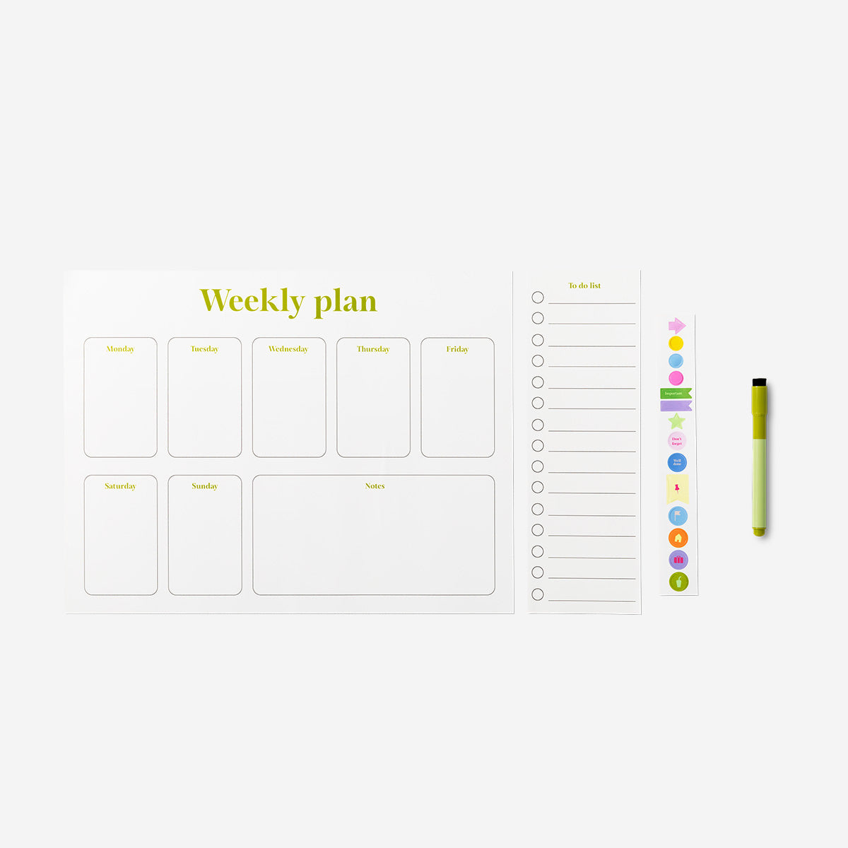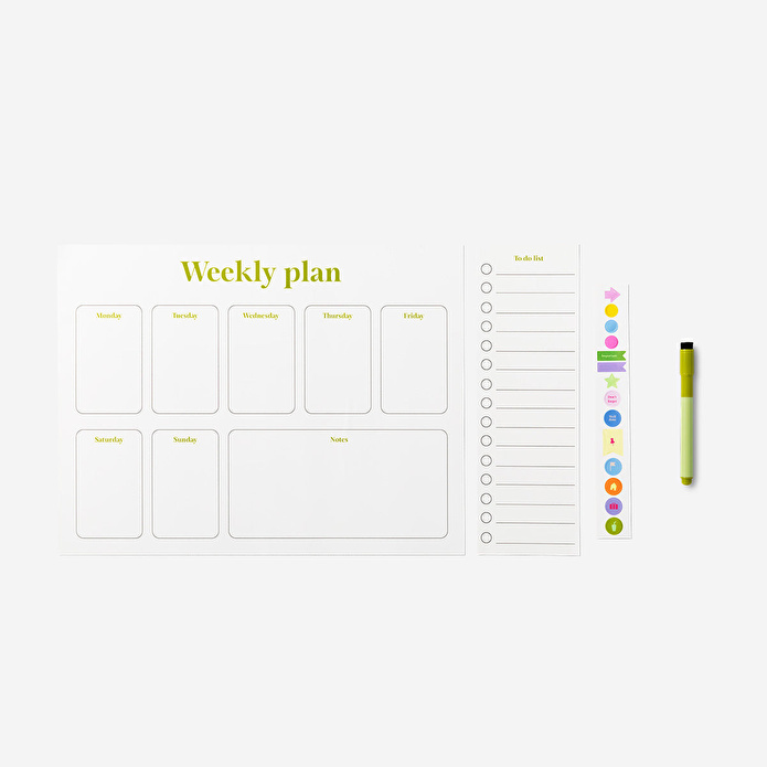 Birlikte gelen keçeli kalem ve işlevsel çıkartmalar, planlamanızı daha eğlenceli ve etkili hale getirir. Yapışkan özelliği sayesinde düz yüzeylere kolayca sabitlenir ve gerektiğinde taşınabilir, bu da onu esnek ve kullanışlı bir organizasyon aracı yapar. Ev ofisleri, ortak çalışma alanları veya bireysel planlama için mükemmel olan Kalemli Beyaz Haftalık Planlayıcı 30 cm x 40 cm, hedeflerinizi yönetmek ve haftalık düzeninizi korumak için pratik bir araçtır.