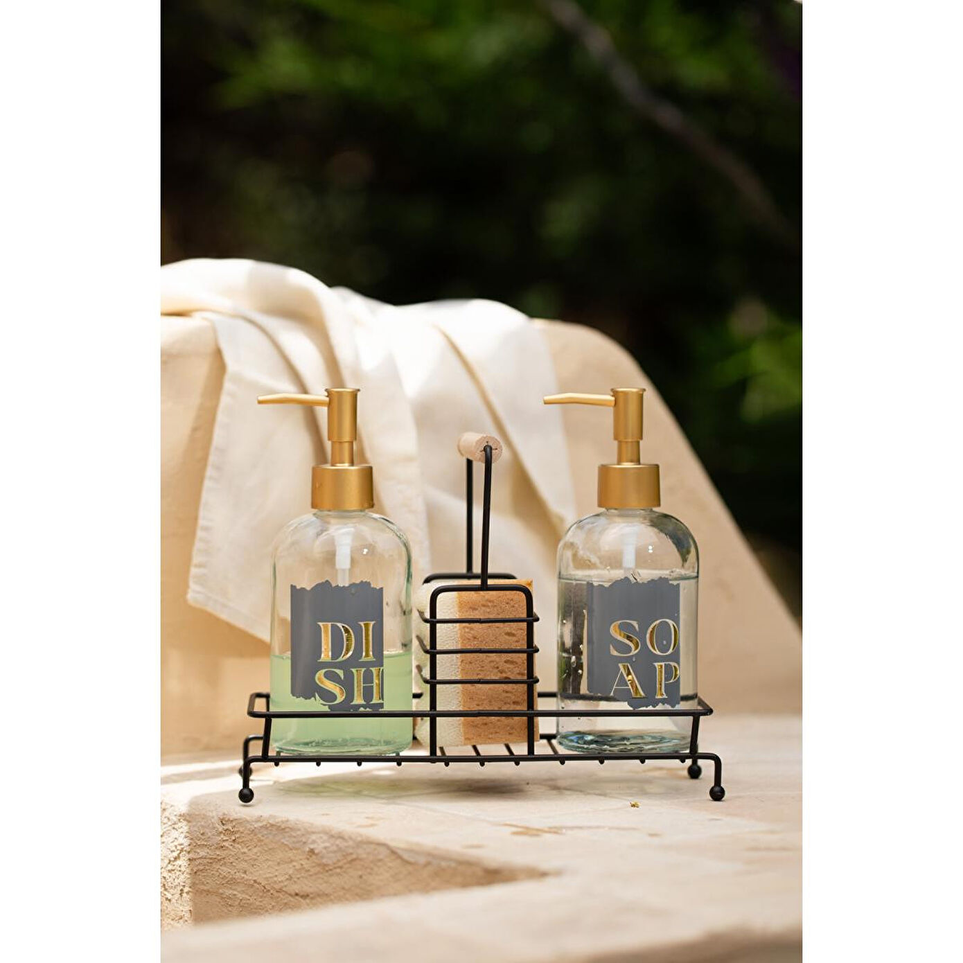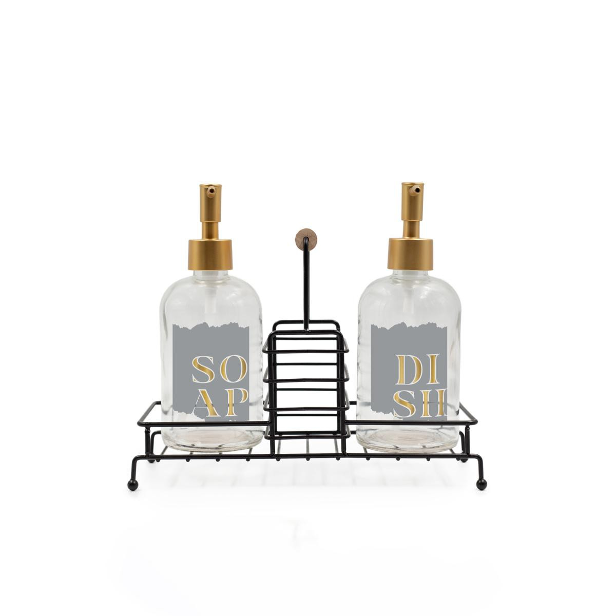 Uzun süreli kullanım için elde yıkanması tavsiye edilir. Hacim: 420 cc Renk: Şeffaf Malzeme: %100 Cam Paket içeriği: 2 adet sıvı sabunluk, 2 adet gold pompa ve 1 adet siyah metal ahşap kulplu stand Cam Ölçüsü Yükseklik: 14 cm Ağız: 2,4 cm Dip: 7,3 cm Genişlik: 7,7 cm