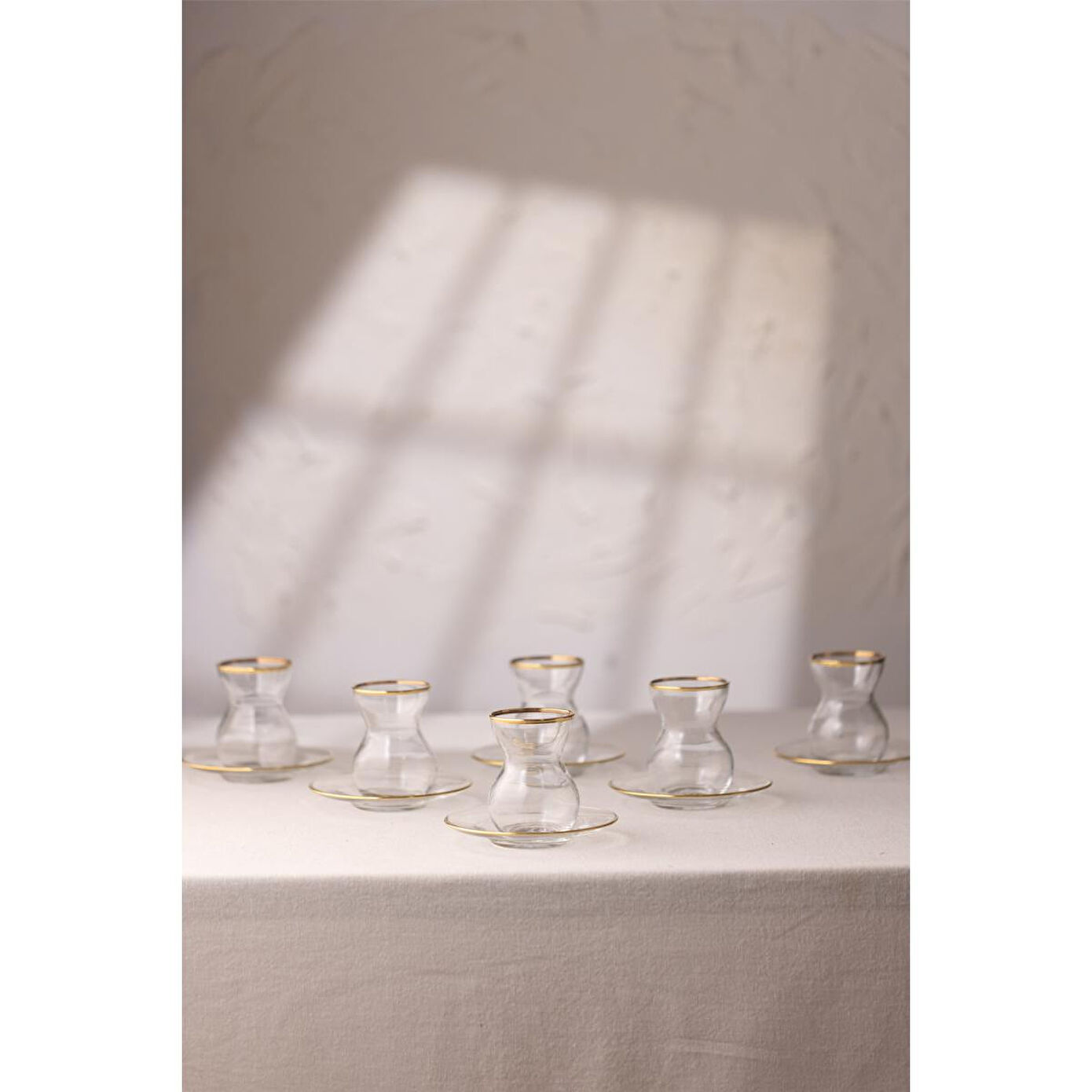 Uzun süreli kullanım için elde yıkanması tavsiye edilir. Hacim: 140 cc Renk: Altın Yaldız Malzeme: %100 Cam Paket içeriği: 6 adet çay bardağı ve 6 adet çay tabağı Cam Ölçüsü Çay Bardağı: Yükseklik: 8,4 cm Ağız: 5,8 cm Dip: 4,1 cm Genişlik: 6,4 cm Çay Tabağı: Yükseklik: 1,7 cm Ağız: 12 cm