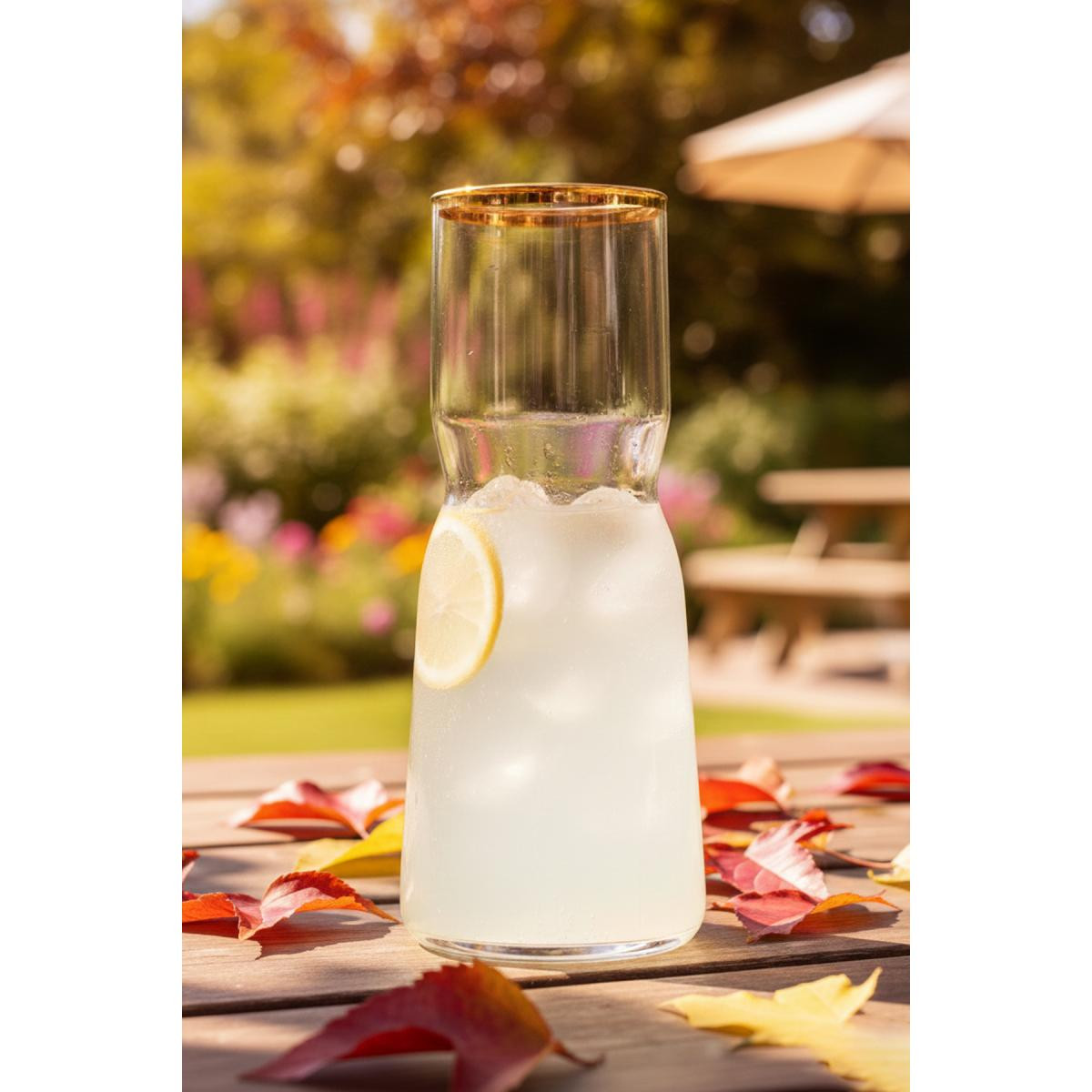 Uzun süreli kullanım için elde yıkanması tavsiye edilir. Hacim: 1000 cc Renk: Altın Yaldız Malzeme: %100 Cam Paket içeriği: 1 adet karaf Cam ÖlçüsüYükseklik: Yükseklik: 24 cm Ağız: 9,8 cm