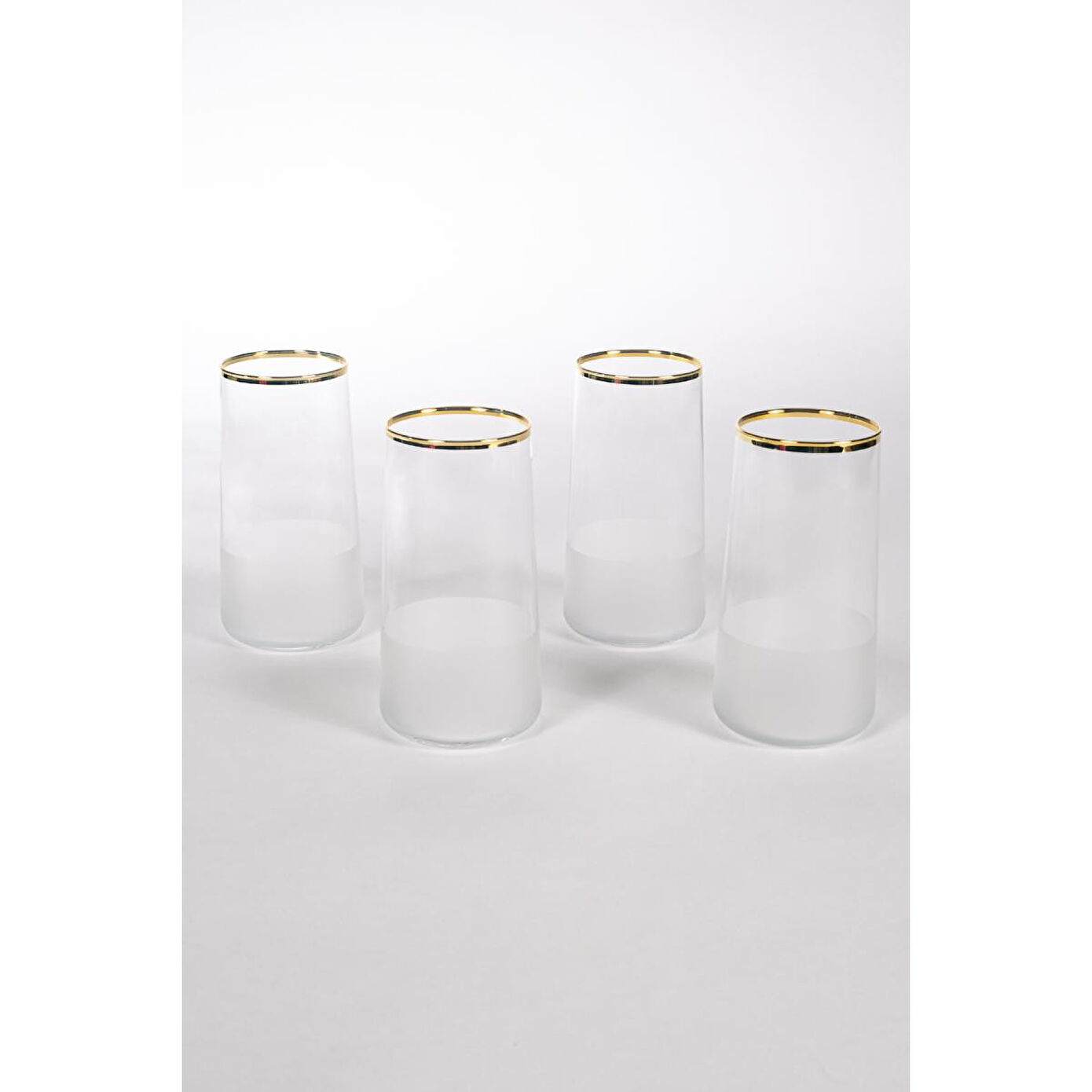 Uzun süreli kullanım için elde yıkanması tavsiye edilir. Hacim: 520 cc Renk: Altın Yaldız Malzeme: %100 Cam Paket içeriği: 4 adet meşrubat bardağı Cam Ölçüsü Yükseklik: 15 cm Ağız: 6,6 cm Dip: 8 cm