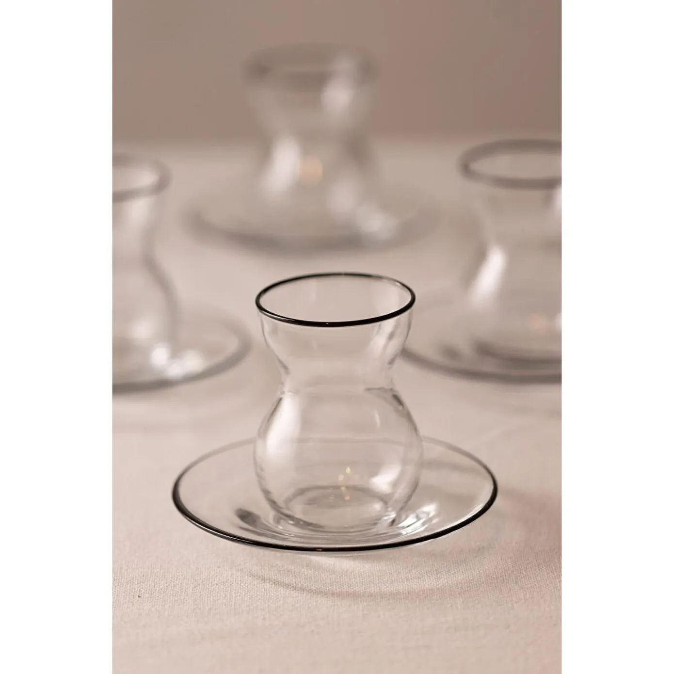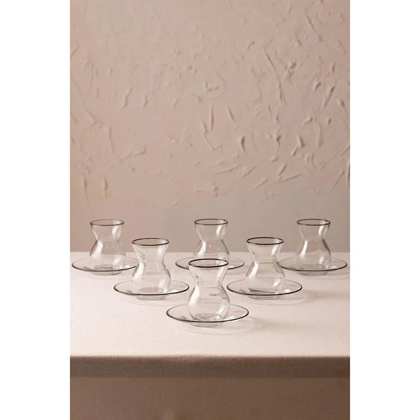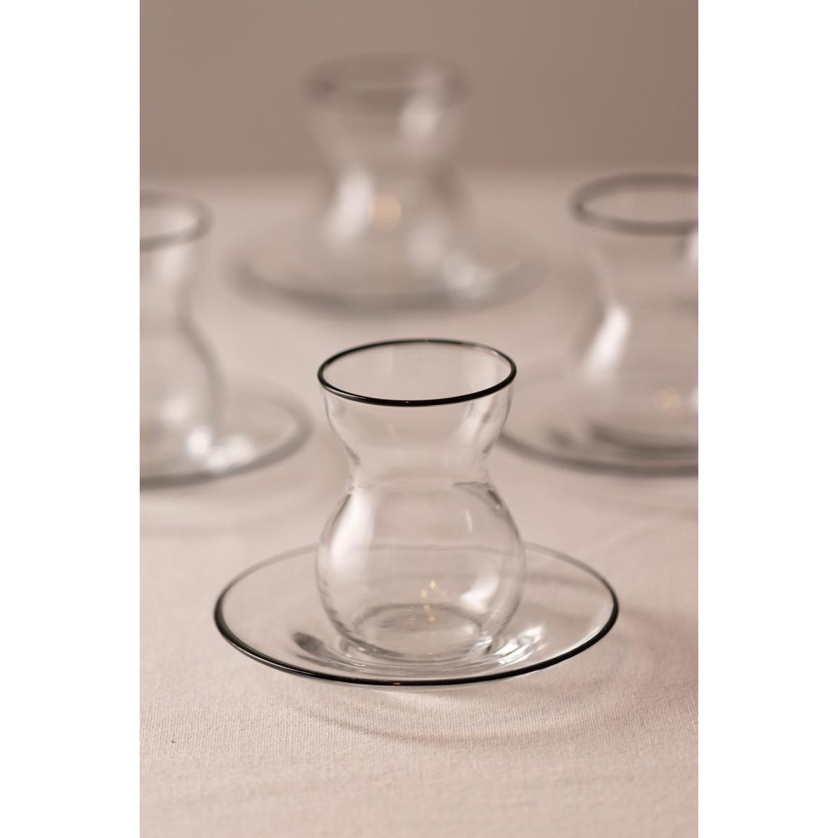 Uzun süreli kullanım için elde yıkanması tavsiye edilir. Hacim: 140 cc Renk:Çay Bardağı: Siyah RimÇay Tabağı: Siyah Rim Malzeme: %100 Cam Paket içeriği: 6 adet çay bardağı ve 6 adet çay tabağı Cam Ölçüsü Çay Bardağı: Yükseklik: 8,4 cm Ağız: 5,8 cm Dip: 4,1 cm Genişlik: 6,4 cm Çay Tabağı: Yükseklik: 1,7 cm Ağız: 12 cm