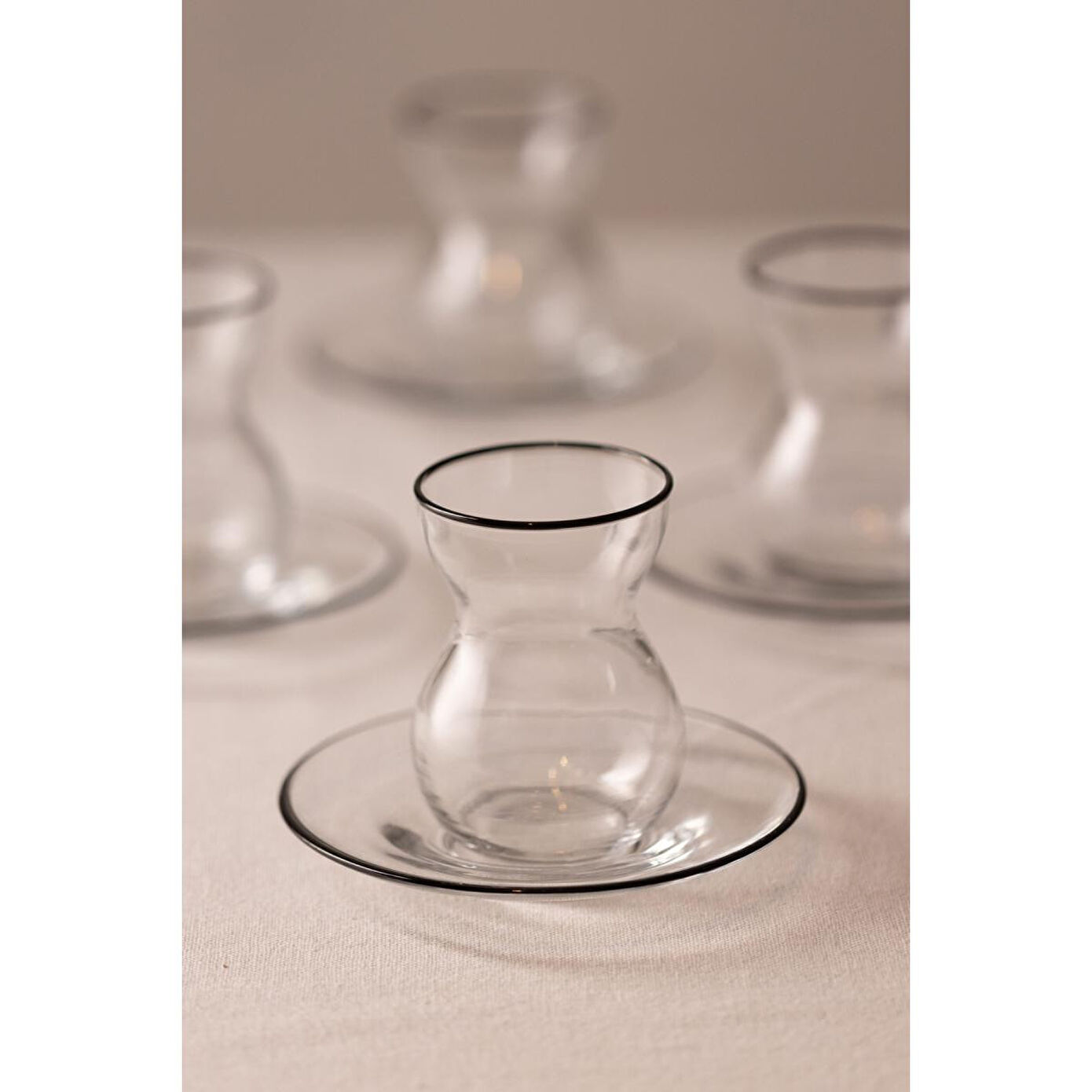 Uzun süreli kullanım için elde yıkanması tavsiye edilir. Hacim: 140 cc Renk: Siyah Rim Malzeme: %100 Cam Paket içeriği: 6 adet çay bardağı ve 6 adet çay tabağı Cam Ölçüsü Çay Bardağı: Yükseklik: 8,4 cm Ağız: 5,8 cm Dip: 4,1 cm Genişlik: 6,4 cm Çay Tabağı: Yükseklik: 1,7 cm Ağız: 12 cm