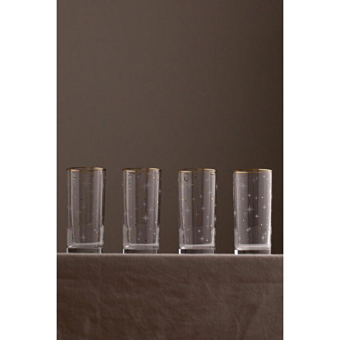 Uzun süreli kullanım için elde yıkanması tavsiye edilir. Hacim: 380 ccRenk: Altın YaldızMalzeme: %100 CamPaket içeriği: 4 adet meşrubat bardağıCam ÖlçüsüYükseklik: 15 cm Ağız: 6,8 cm Dip: 6,2 cm