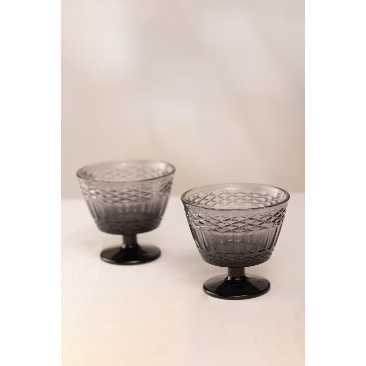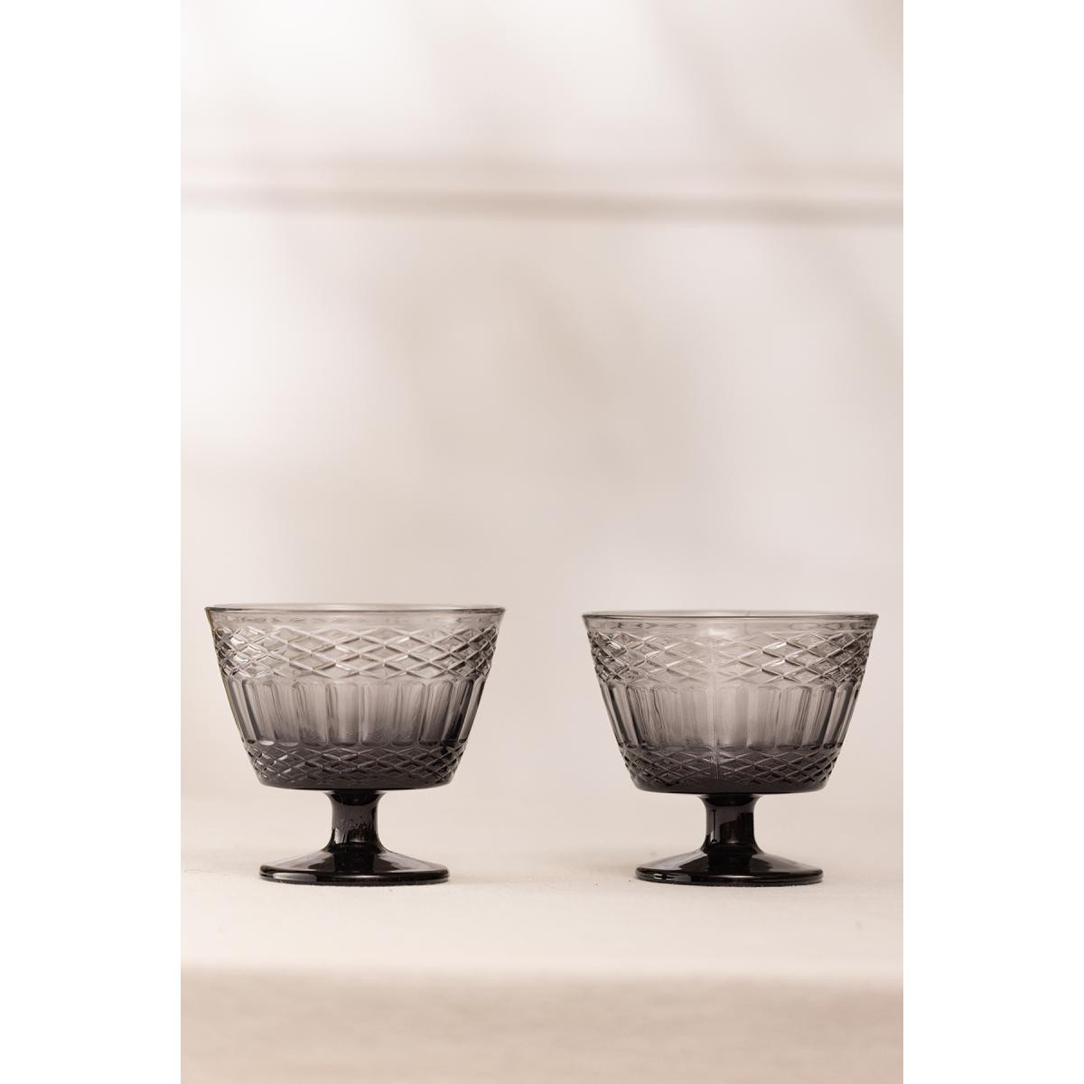 Uzun süreli kullanım için elde yıkanması tavsiye edilir. Hacim: 350 cc Renk: Füme Malzeme: %100 Cam Paket içeriği: 2 adet dondurmalık Cam Ölçüsü Yükseklik: 10,2 cm Ağız: 11 cm