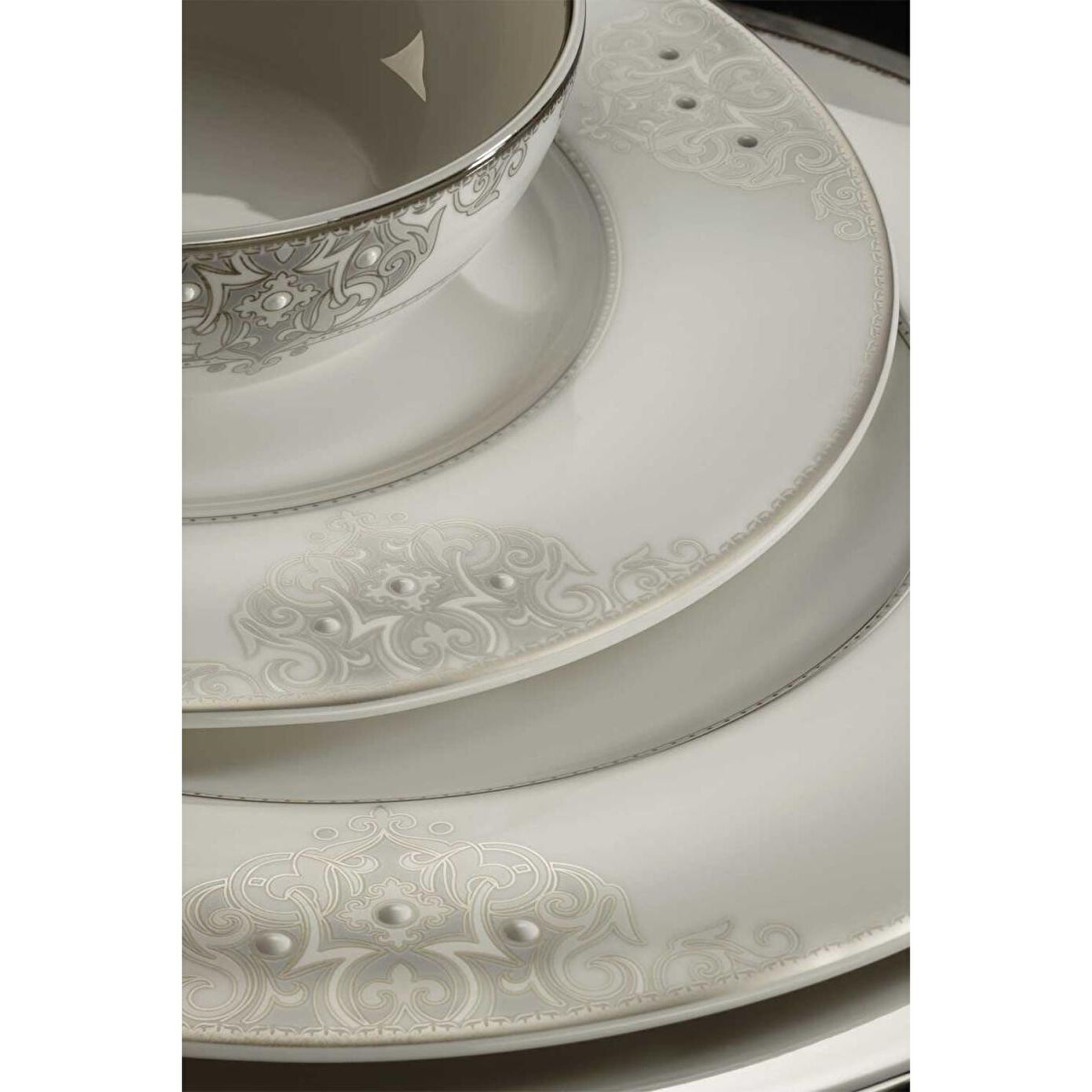 72 Parça Bone China Yemek Takımı 12 Adet Servis Tabağı 27,5 cm 12 Adet Servis Tabağı 22,5 cm 12 Adet Servis Tabağı 17,5 cm 12 Adet Çorba Kasesi 14 cm 12 Adet Çukur Tabak 23,5 cm 2 Adet Servis Tabağı 16X21,5 cm 1 Adet Oval Tabak 29,5X39,5 cm 2 Adet Oval Tabak 25,5X36 cm 1 Adet Salata Kasesi 23 cm 1 Adet Çorba Tenceresi+ 1 Adet Kapağı 3 L 2 Adet Tuzluk 7 cm 2 Adet Karabiberlik 7 cm Royal Porcelain’nin Premium serisi olan Royal Canterbury; en iyi kalite materyallerin kombinasyonu ile hazırlanmış, eşsiz tasarımlara sahip üst segment yemek takımlarını temsil eder. Kurşun içermeyen Bone China ürünler, olağanüstü estetik niteliklere sahip, yarı saydam şeffaflıkta ve parlaktır. İçeriğine eklenen alümina malzemesi ürünleri darbe ve çizilmelere karşı daha dirençli hale getirir. Doğal bileşenleri sayesinde kendine has krem rengi, pürüzsüz dokusu, göz alıcı desenleri ile Royal Canterbury yemek takımları; uzun yıllar boyunca en özel sofraları hazırlamanız, en kıymetli misafirleri ağırlamanız için üretildi.