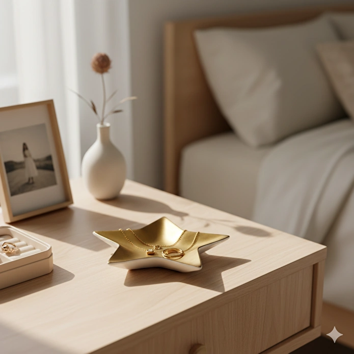 Gold Yıldız Şekilli Seramik Takı Tabağı, yüzüklerinizi, bileziklerinizi veya kolyelerinizi düzenli tutarken, aynı zamanda odanıza mistik bir hava getirir. Hem işlevsel hem de dekoratif özellikleri sayesinde, her iç mekanda dikkat çekici bir parça haline gelir. Mücevherlerinizi güvenle saklamak için mükemmel bir seçenek olan bu takı tabağı, modern ev dekoru ile uyum içinde olan çok yönlü bir aksesuardır.
