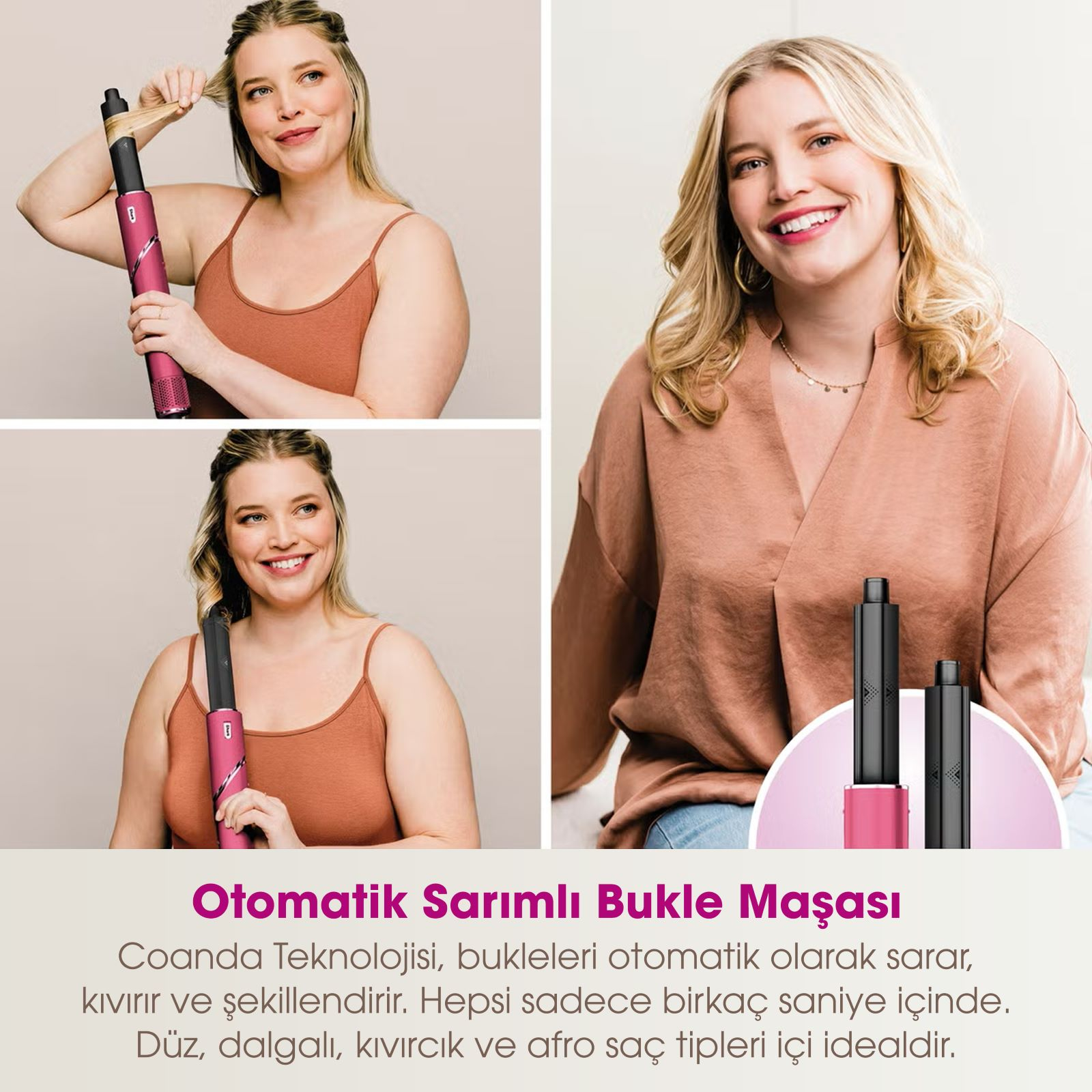 Auto-Wrap Başlığı: Kıvırma şeklinizi değiştirin. Coanda Teknolojisi, saçınızı varilin etrafına sarar, kıvırır ve otomatik olarak ayarlar. Saçınızı varil yakınında tutarak zahmetsizce kıvrılmalar yaratın. İki kıvırıcı aparat ile saçlarınızı her iki yönde kıvırarak yüzünüzü çerçeveleyen bir görünüm elde edin. En iyi düz ve dalgalı saçlar için uygundur.