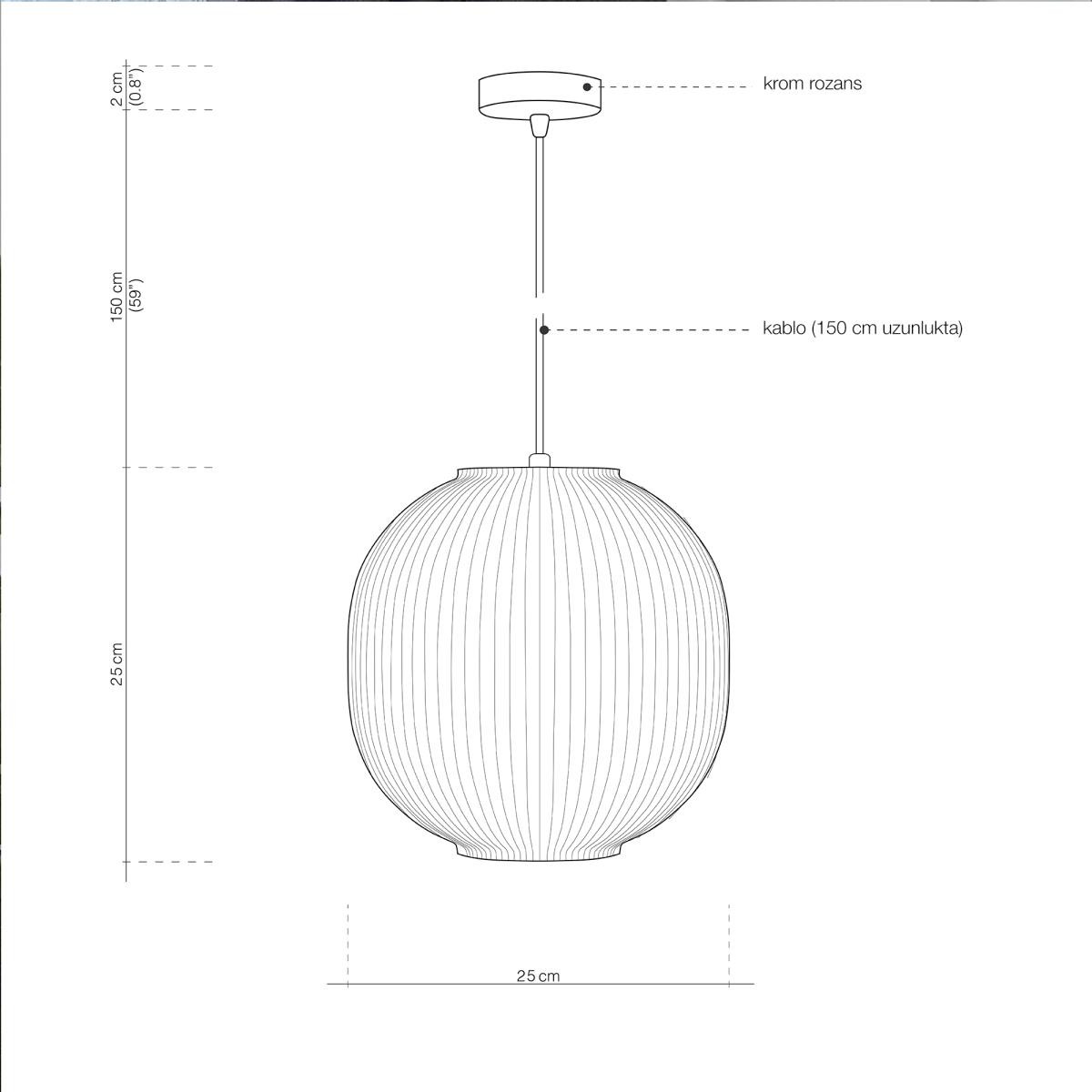 - Boyut ⌀25x25 cm - Ağırlık 700 g - Kablo ~1.5 m uzunlukta kablo (siyah/beyaz) - Montaj ⌀10x2 cm metal rozans (siyah/beyaz) - Ampul E27 LED ampuller ile kullanılmalıdır. Akıllı ampuller ile uyumludur. Akkor ya da halojen ampuller ile kullanıma uygun değildir. (Ampul pakete dahil değildir) - Malzeme Bitkisel bazlı doğada çözünebilen biyopolimer hammadde PLA ile üretilmektedir. Cam, kağıt ya da seramik değildir. Dayanıklı bir yapıya sahiptir. - İç mekanda kullanıma uygundur.
