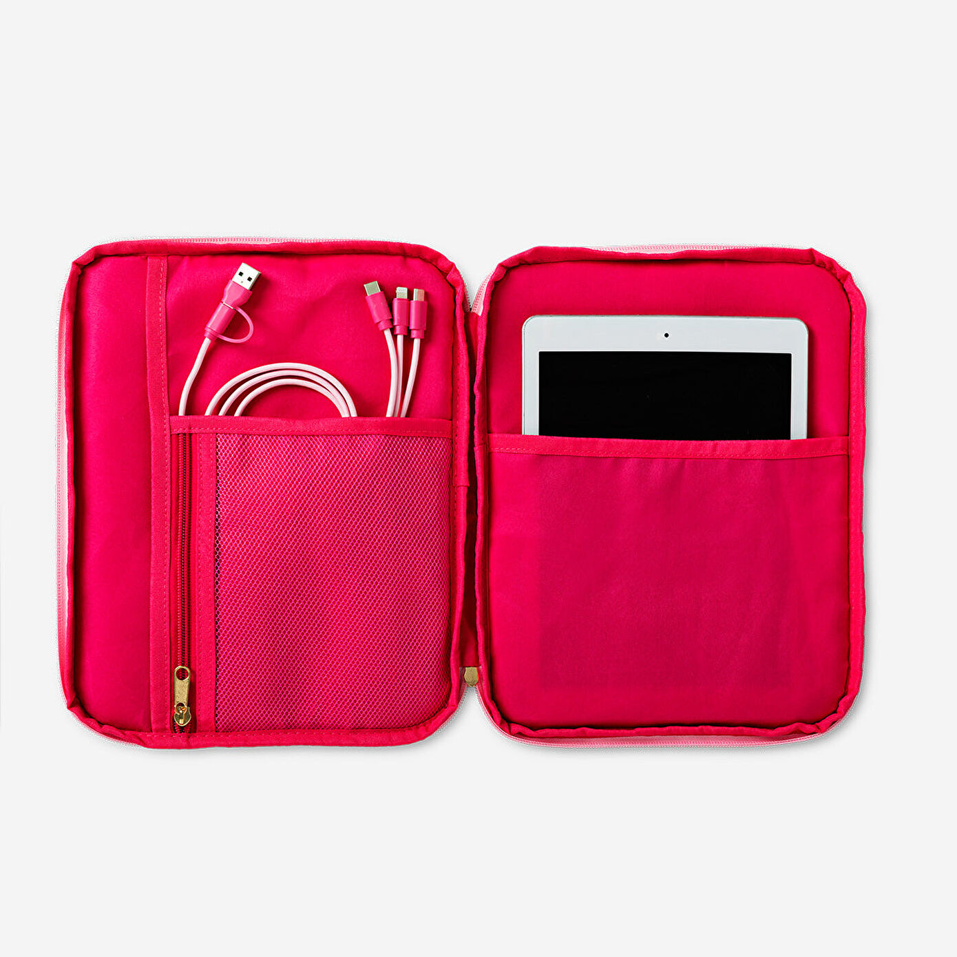 Yumuşak pembe tonlarındaki zarif çiçek desenleri, çantaya hem modern hem de feminen bir hava katar. Çanta, cihazınızı çizilmelere ve darbelere karşı koruyacak şekilde dayanıklı bir dış yüzeye ve yumuşak astarlı bir iç kısma sahiptir. İçerisinde kablolar, şarj cihazları, kalemler ve diğer küçük aksesuarlar için özel bölmeler bulunur ve bu sayede eşyalarınız düzenli bir şekilde saklanabilir.