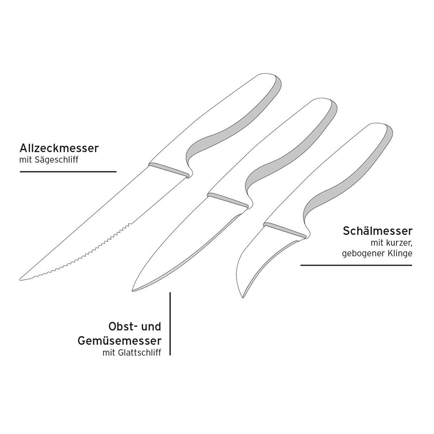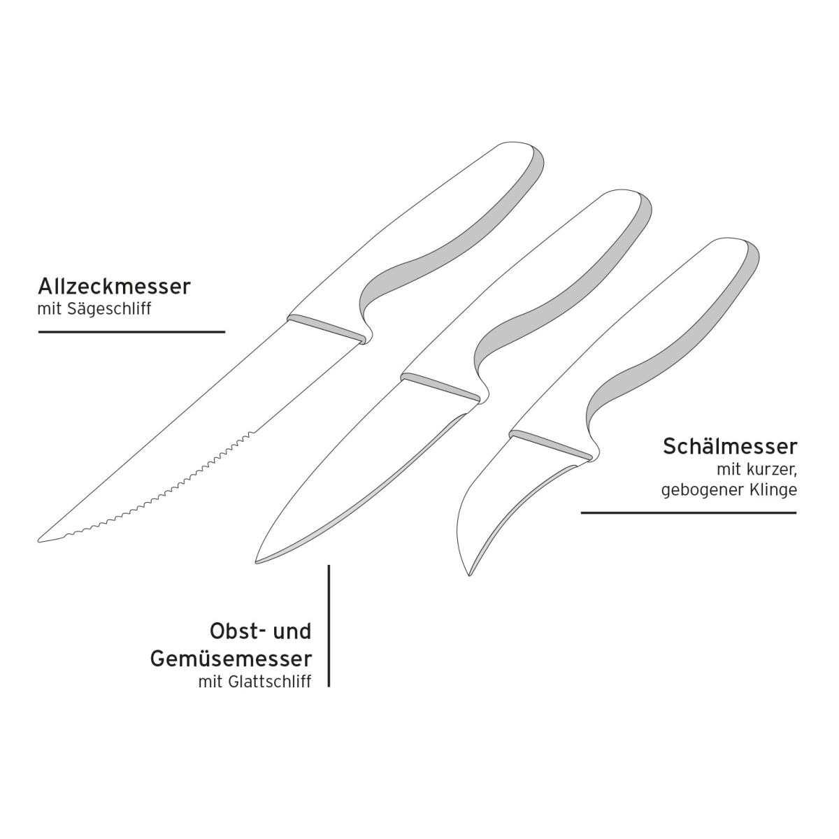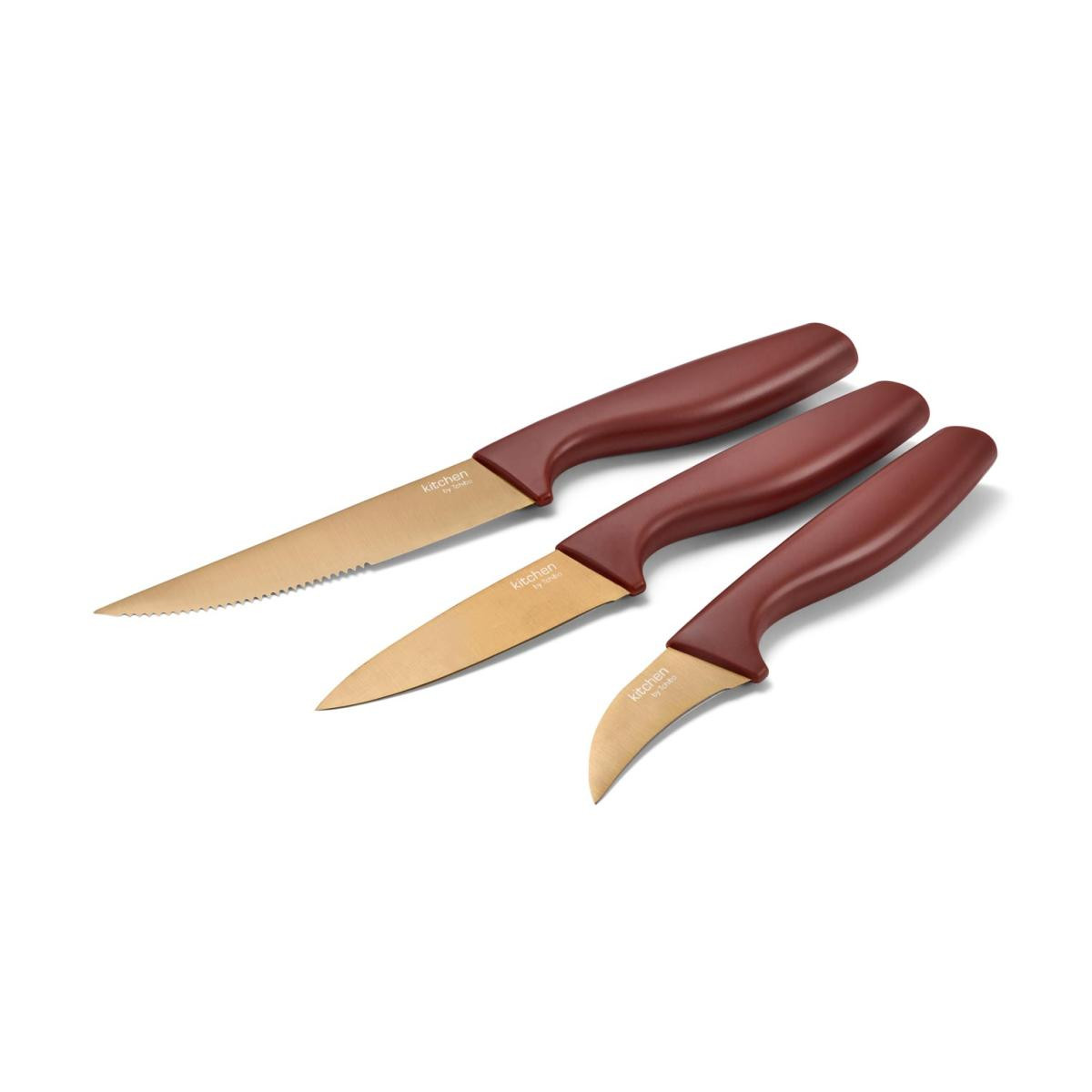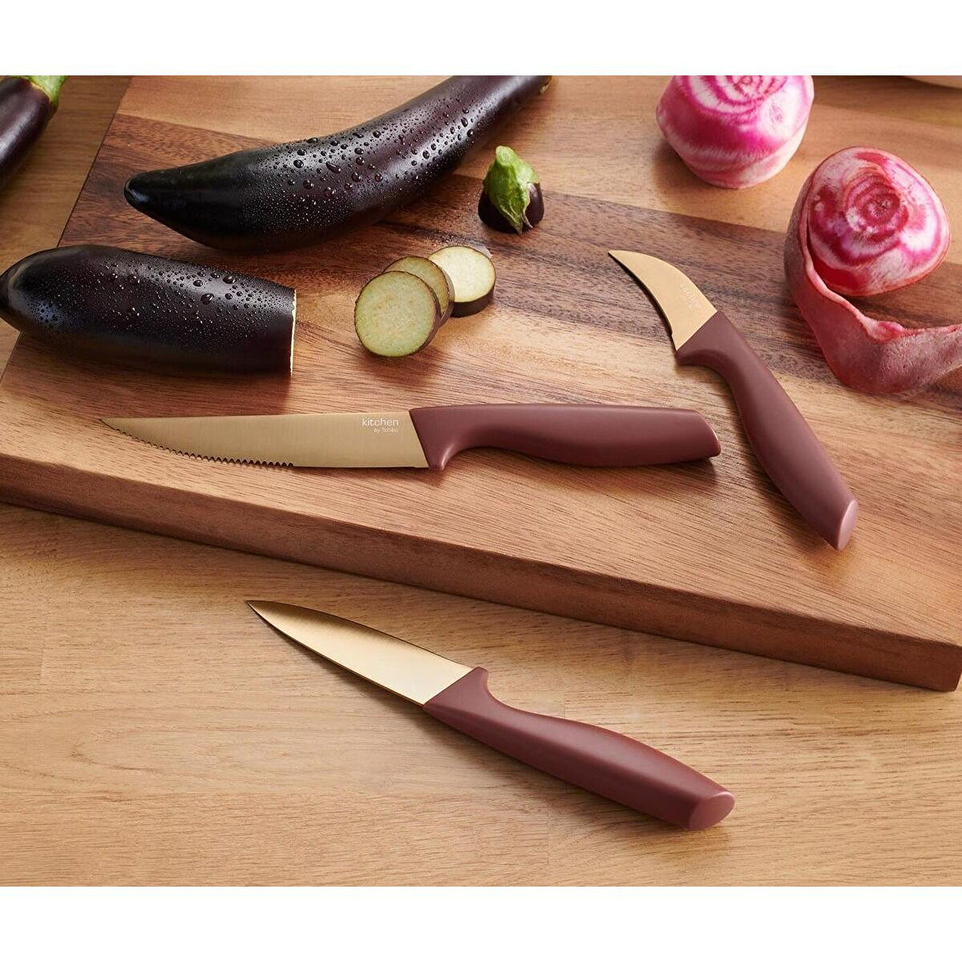 3 Adet Mutfak Bıçağı Renk: Saplar koyu kırmızıBıçak kısmı altın rengi Malzeme: PVD kaplama paslanmaz çelik bıçak kısmıSaplar akrilonitril bütadien stiren kopolimer ve termoplastik elastomerler (termoplastik lastik) Ölçüler: Çok amaçlı bıçağın toplam uzunluğu yakl. 23,5 cm, bıçak kısmının uzunluğu yakl. 13 cmMeyve ve sebze bıçağının toplam uzunluğu yakl. 20,5 cm, bıçak kısmının uzunluğu yakl. 9,5 cmSoyma bıçağının toplam uzunluğu yakl. 17 cm, bıçak kısmının uzunluğu yakl. 6 cm İçerik/Aksesuar: Kullanma kılavuzu dahildir Bıçak çeliğinden PVD kaplamalı konik bıçaklar|Her amaç için doğru bıçak: soyma bıçağı, meyve ve sebze bıçağı, çok amaçlı bıçak|Kaymaz plastik saplı|Soyma bıçağı kısa, kavisli kesicili|Düz yüzeyli meyve ve sebze bıçağı|Çok amaçlı bıçak testere yüzeyli