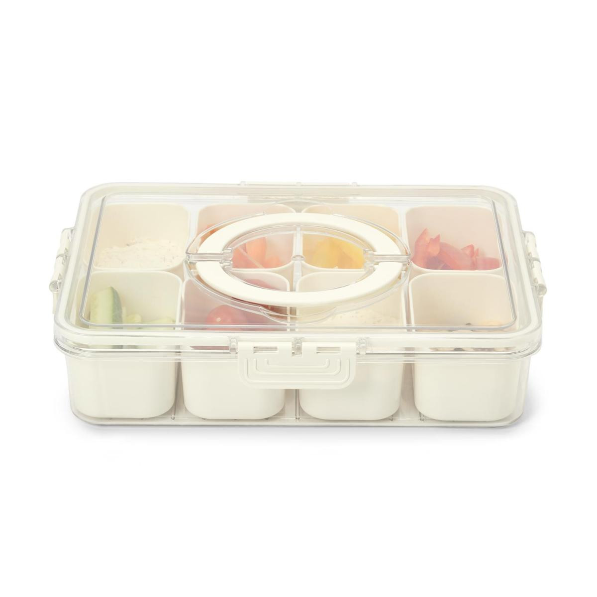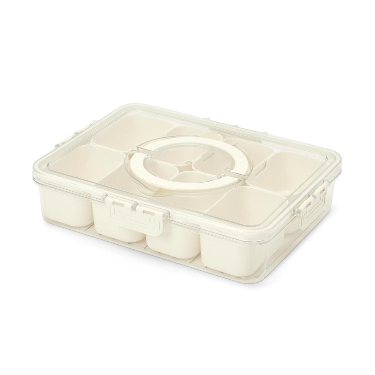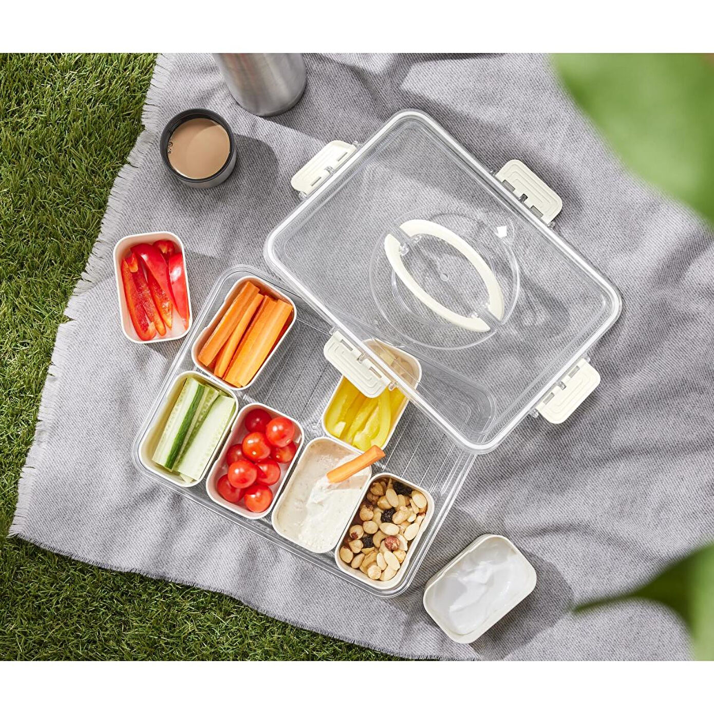 Yolculuk İçin Atıştırmalık Kutusu Renk: Kutu ve kapak saydamKaplar ve tutamaklar krem beyaz Malzeme: Kutu ve kapak %100 polietilen tereftalatKaplar ve tutamaklar %100 polipropilen Ölçüler: G x Y x D yakl. 31 x 6,5 x 24 cmKapların G x Y x D yakl. 10,5 x 5 x 7 cm Ağırlık: Yakl. 745 g Taşıma Kuvveti: Maks. 3 kg Kullanım Uyarıları: Mikrodalga için uygun değildir8 ayrı kap bulaşık makinesinde yıkanabilir, saydam taşıma kutusu elde yıkanır 3'ü 1 arada: Taşımak, saklamak ve servis etmek|Çıkarılabilir 8 ayrı kap|Doğranmış sebze, meyve, tatlılar veya başka atıştırmalıklar için ideal|Klipsli kapak içine kir girmesini önler|Konforlu şekilde taşımak için tutacaklar