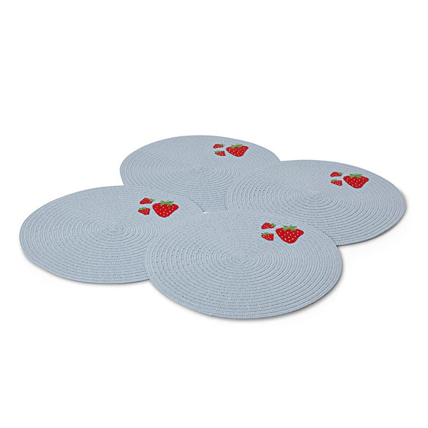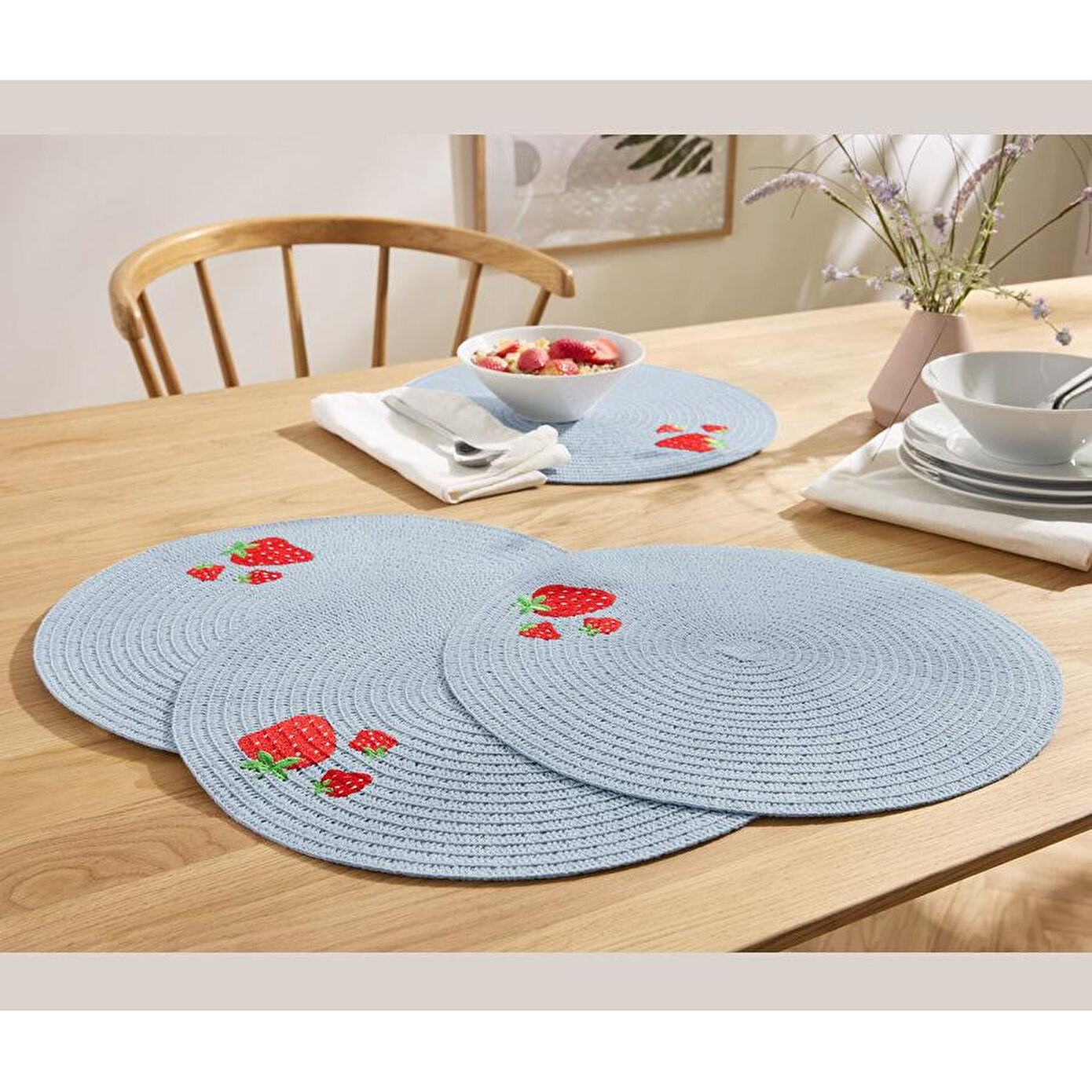 Önemli Bilgiler; Hasır örgü görünümlü kumaştan yapılmıştır. Çilek işlemelidir. Her bir Amerikan servisin çapı yaklaşık 35 cm'dir. Mat görünümlüdür. Kesin Bilgiler; Malzeme: %100 polyester Ölçü değeri; Her bir Amerikan servisin çapının yaklaşık 35 cm Renk;Üzerinde çilek işlemesi olan açık mavidir.