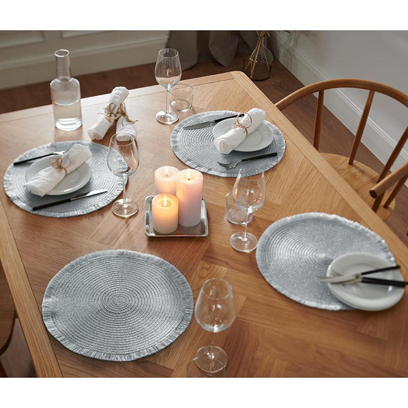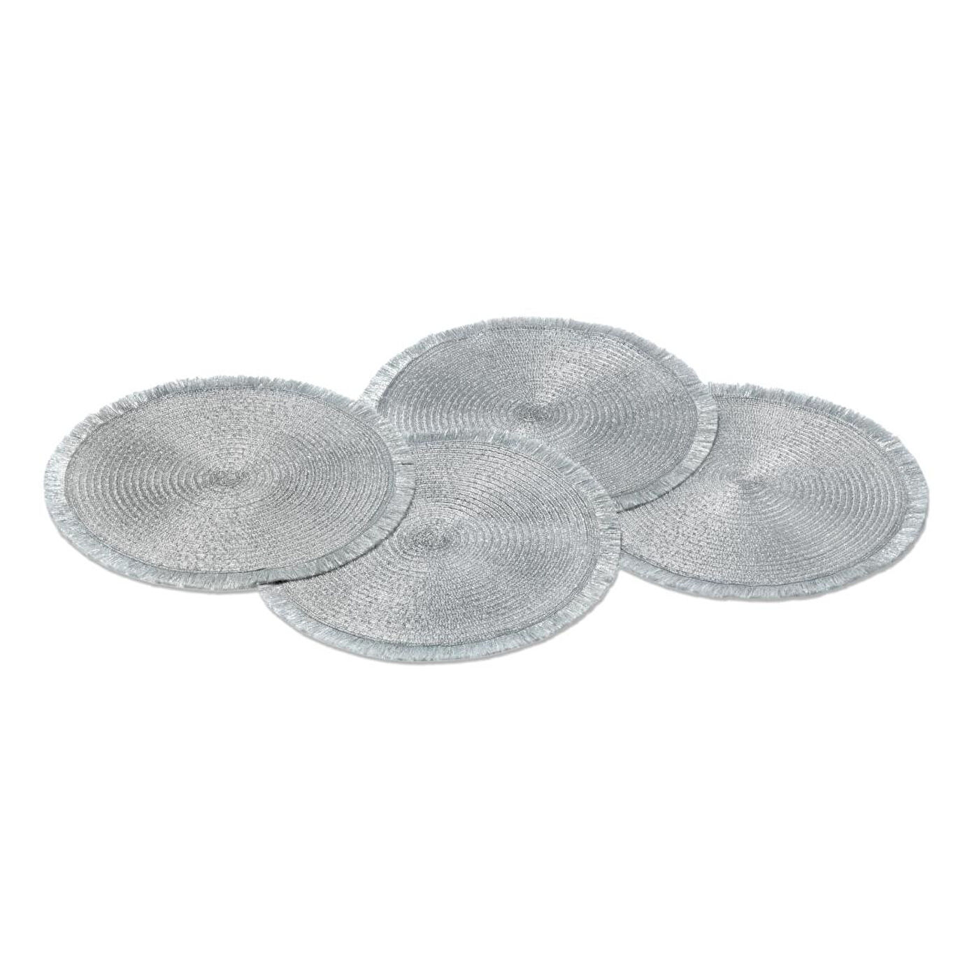 4 Adet Amerikan Servisi, Gümüş Rengi Renk: Gümüş rengi Malzeme: %90 polyester (geri dönüştürülmüş), %10 polyester, metalleştirilmiş Ölçüler: Her birinin çapı yakl.; 35 cm Parlak iplikli, dayanıklı polyester dokuma|Dekoratif ve kutlamaya uygun|Saçaklı|Geri dönüştürülmüş malzemeli|Bu amerikan servisler PET şişe içerir.