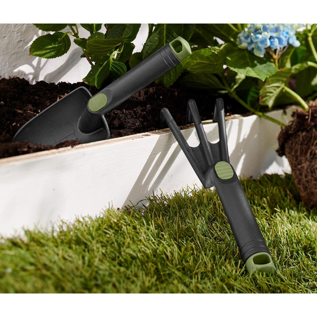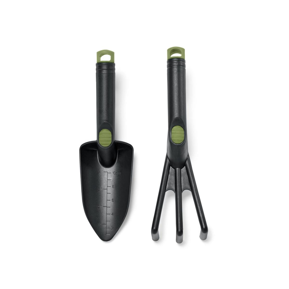 Bahçe Aleti Seti Renk: Zeytin yeşili detaylı siyah renk Malzeme: Polipropilen, termoplastik elastomerler (termoplastik kauçuk) Ölçüler: Her biri yakl. 27,5 x 8 cm Çiçekliklerde ve saksılardaki bahçe işleri için|Set halinde kürek ve tırmık|Kolay kullanım için hafif materyal|Asmak için delikli sap