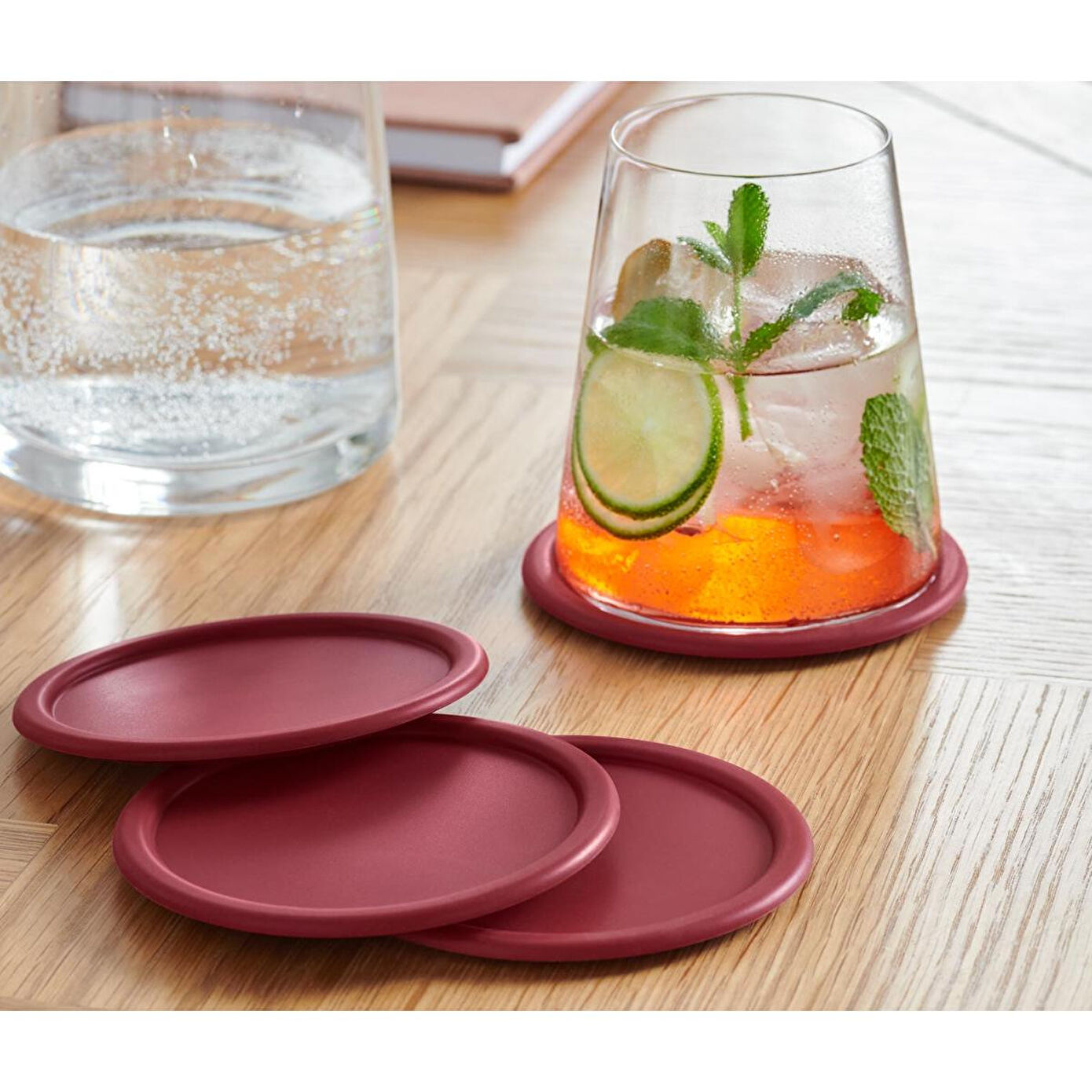 4 Adet Bardak Altlığı Renk: Koyu kırmızı Malzeme: %100 silikon Ölçüler: Her biri Ø yakl.; 10 cmHer birinin kalınlığı yakl.; 3 mmHer bir kenar yakl.; 6 mm Kullanım Uyarıları: 0 °C ila 40 °C arası sıcaklığa dayanıklı Kaymaz silikondan|Hassas masa yüzeylerini bardak izlerine veya su lekelerine karşı korur|Bulaşık makinesinde yıkanabilir