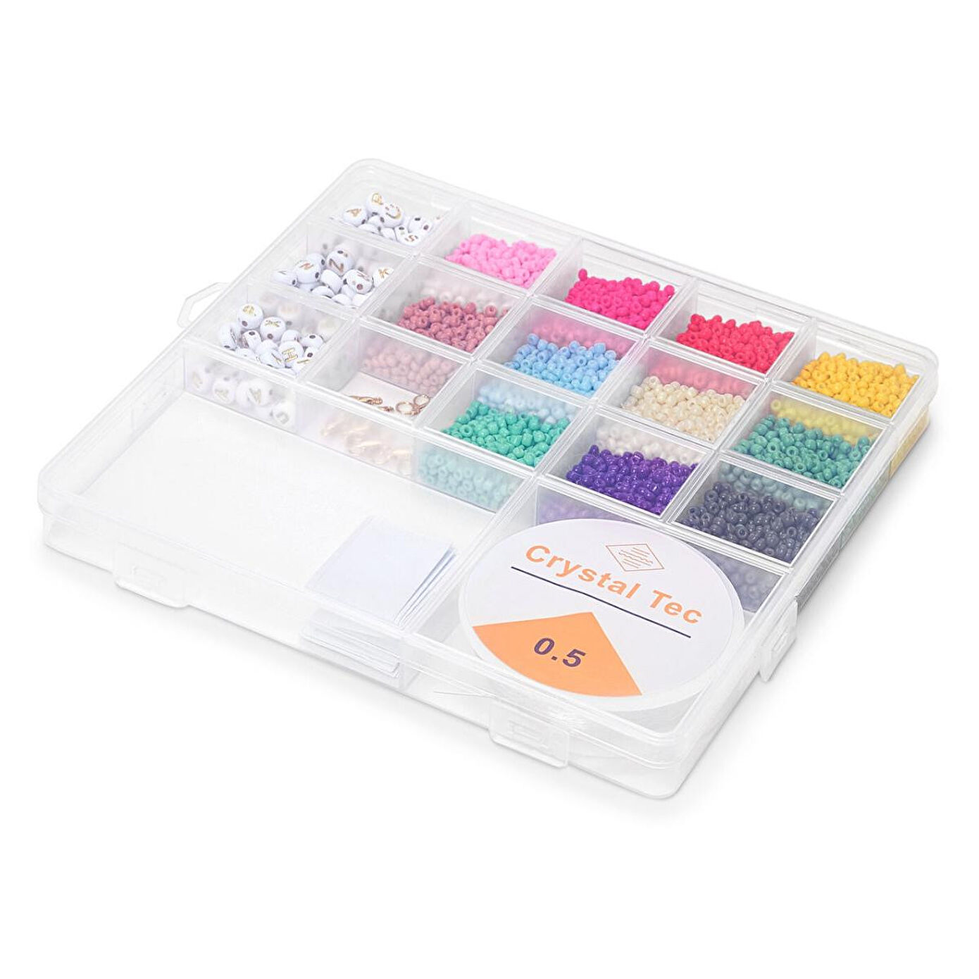 Örn. bileklik ve kolye yapmak için 11 farklı boncuk rengi, harfli boncuk, gülen yüzlü boncuk, kancalar ve bir bant içerir Her renkten 400'er boncuk, 120'şer harf ve gülen yüz boncuk Zararlı madde kontrolü yapılmıştır – harici, akredite kuruluşlar tarafından Renk Çok renkli Malzeme Cam boncuk Harfler ve gülen yüzler %100 polimetilmetakrilat Saklama kutusu %100 polipropilen Kancalar metal Elastik bant %100 poliamid Ölçüler Boncukların çapı yakl. 3 mm Harflerin ve gülen yüz boncukların çapı yakl. 7 mm Kancalar yakl. 10 mm. Saklama kutusunun G x Y x D yakl. 17 x 2 x 18,5 cm İçerik 11x 400 boncuk, 120 harf ve gülen yüz, kancalar ve yapım talimatı dahildir
