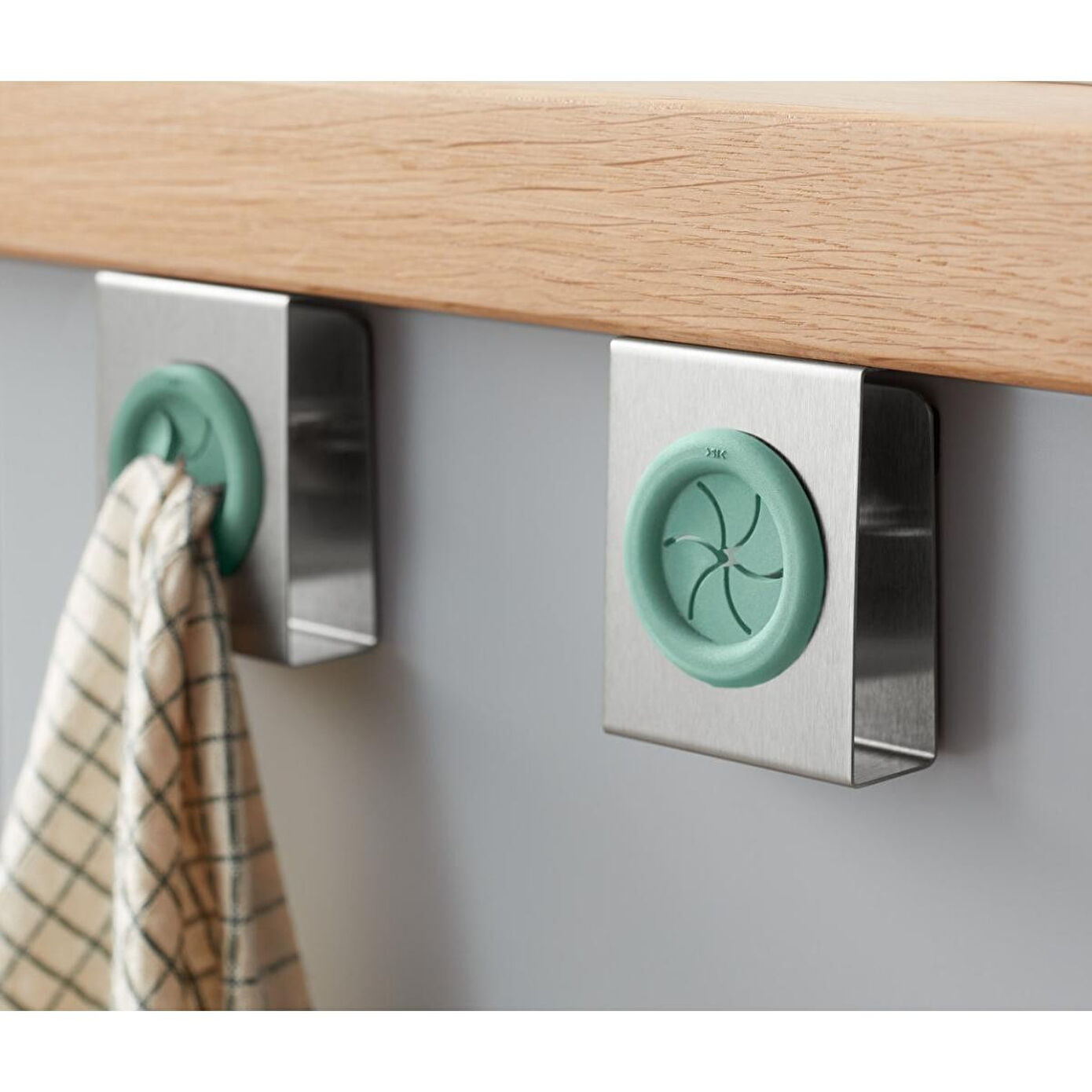 Bulaşık ve temizlik bezlerini hızlıca asın Kertik kalınlığı yakl. 1,9 cm'ye kadar olan dolap kapıları, kapılar, raflar vb. için uygun Fırçalanmış mat paslanmaz çelikten Kolay asılır: delmeden, yapıştırmadan Zararlı madde kontrolü yapılmıştır – harici, akredite kuruluşlar tarafından İçerik Renk Tutacak mat paslanmaz çelik rengi Yeşim yeşili parçalar Malzeme Tutucu paslanmaz çelik, fırçalanmış Parçalar %100 silikon Koruyucu keçe Ölçüler G x Y x D yakl. 5 x 6 x 4 cm Taşıma Kuvveti Her biri maks. 1,5 kg Kullanım Uyarıları Kertik kalınlığı 16 mm - 19 mm arasında olan standart dolap kapakları ve kapılar için uygundur