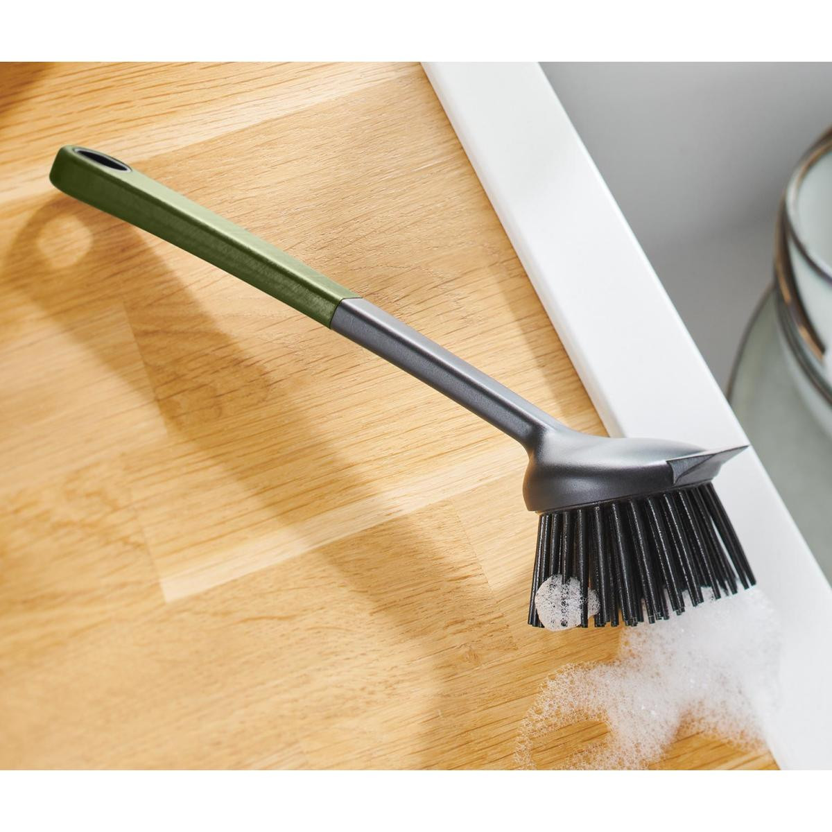 Kazıyıcılı Bulaşık Fırçası Renk: Sap koyu yeşilBaşlık ve kazıyıcı siyah Malzeme: Sap %50 polipropilen, %50 polipropilen (geri dönüştürülmüş)Fırça kılları ve Softgrip %100 termoplastik elastomer (termoplastik kauçuk)Askı kordonu %100 polyester Ölçüler: Toplam uzunluk yakl.; 23 cmBaşlık çapı yakl.; 4,5 cmKazıyıcı yakl.; 2,5 x 1 cmFırça kıllarının uzunluğu yakl.; 2,5 cm İçerik/Aksesuar: Askı kordonu dahildir Uzun ömürlü fırça kılları|Kazıyıcı yanık artıkları da temizleyebilir|Ergonomik sap |Asma halkalı|Bu bulaşık fırçası doğal kaynakları korur.
