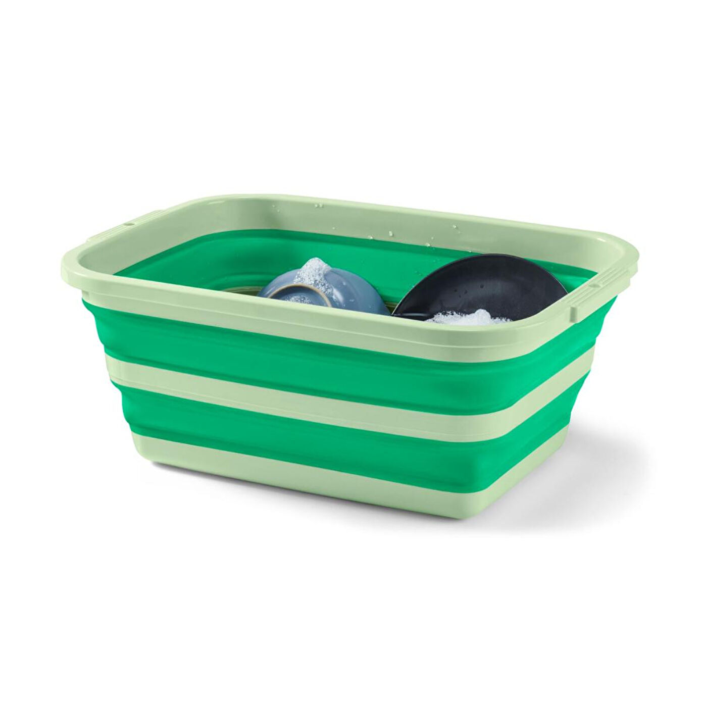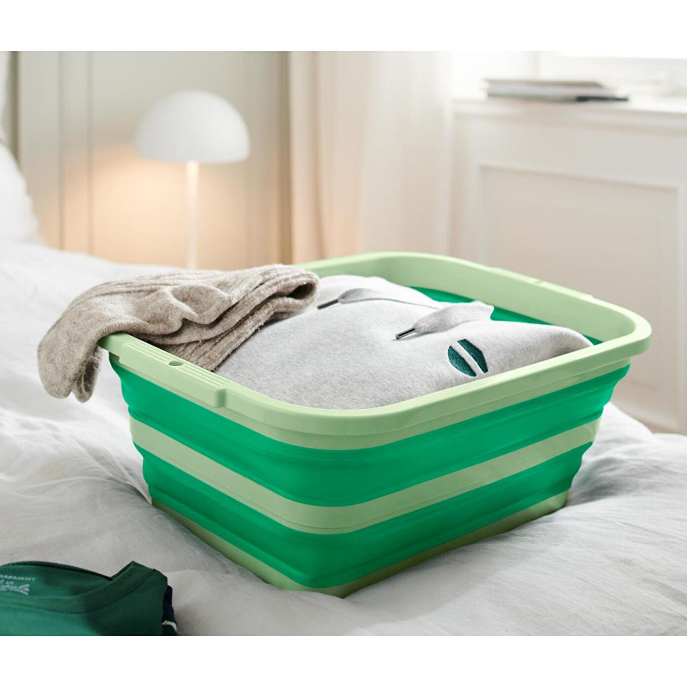 Katlanabilir Çamaşır ve Bulaşık Sepeti Renk: Açık yeşil-koyu yeşil Malzeme: Sert kısımları %100 polipropilenKatlanabilir kısımları %100 termoplastik elastomer (termoplastik kauçuk) Ölçüler: G x Y x D yakl.; 47,5 x 18,5 x 34,5 cm, katlanmış halde yakl.; 47,5 x 4,5 x 34,5 cm Taşıma Kuvveti: Maks.; 15 kg Dolum kapasitesi: Yakl.; 16 L Kullanım Uyarıları: –20 °C ile +70 °C arası sıcaklığa dayanıklı Birkaç saniye içerisinde katlanabilir ve yer kaplamadan saklanabilir|Her yerde saklanabilir – nişlere ve köşelere de sığar|Yıkanacak veya yıkanmış çamaşırları taşımak için ideal|Dayanıklı, sağlam plastikten – nemli bezle silinebilir |Yolculuk için de uygundur|Kapasitesi yakl.; 16 litre
