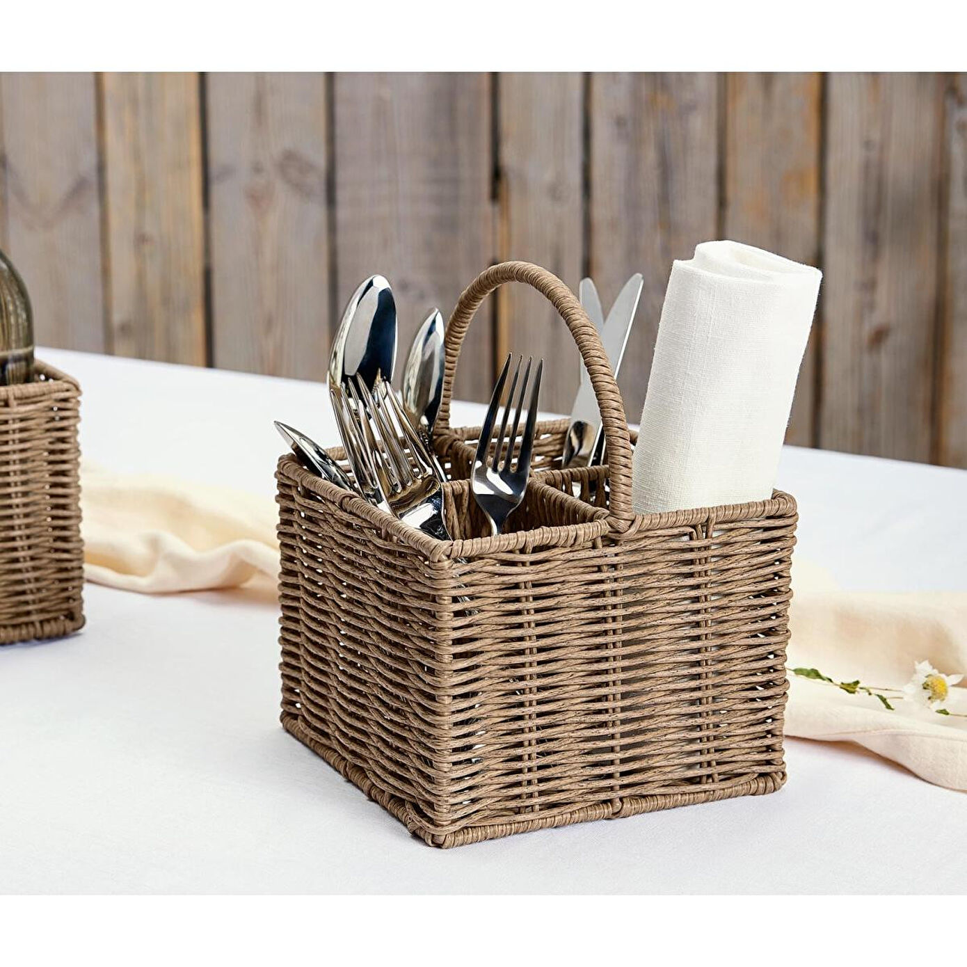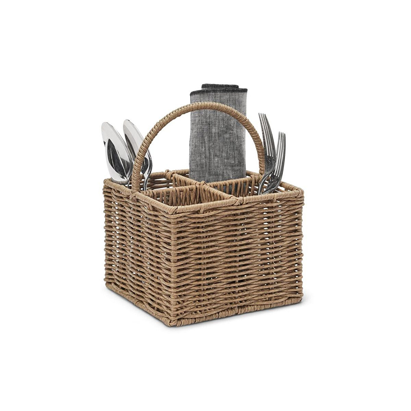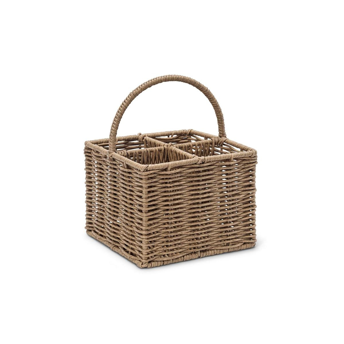 Servis Sepeti Renk: Açık kahverengi Malzeme: Örgü polipropilenTel çelik, toz kaplama Ölçüler: G x Y x D yakl. 17,5 x 13,5 x 17,5 cmTutacak dahil yükseklik yakl. 22 cmBölmelerin her biri yakl. 8 x 8 cm Ağırlık: Yakl. 560 g Kullanım Uyarıları: Sadece kuru gıdalar için uygundur İç ve dış mekan kullanımı için uygundur|Plastik hasır örgülü sağlam metal iskelet – nemli bezle silinebilir|Mutfak aletleri, çatal-bıçak, baharatlar, soslar vb. için çok yönlü saklama ve taşıma imkanı|Kolay taşımak için saplı|4 bölmeli