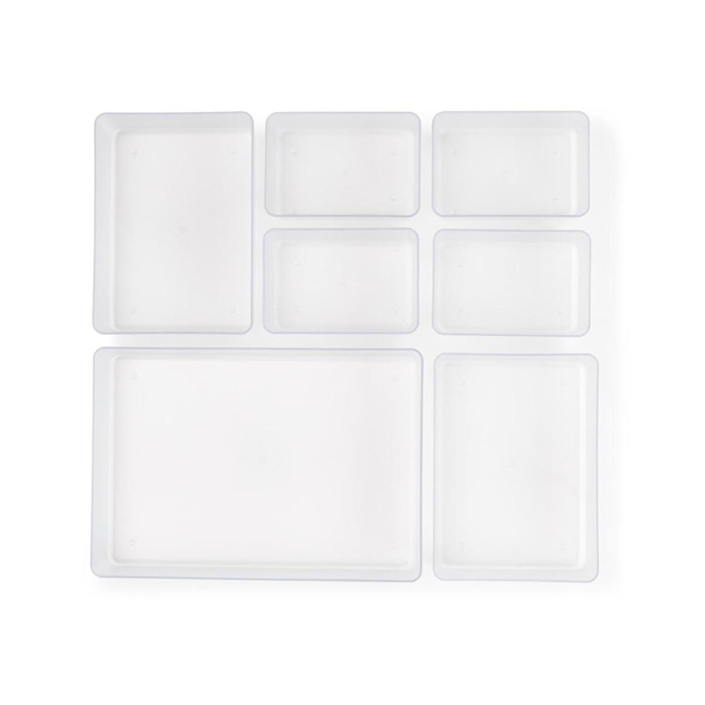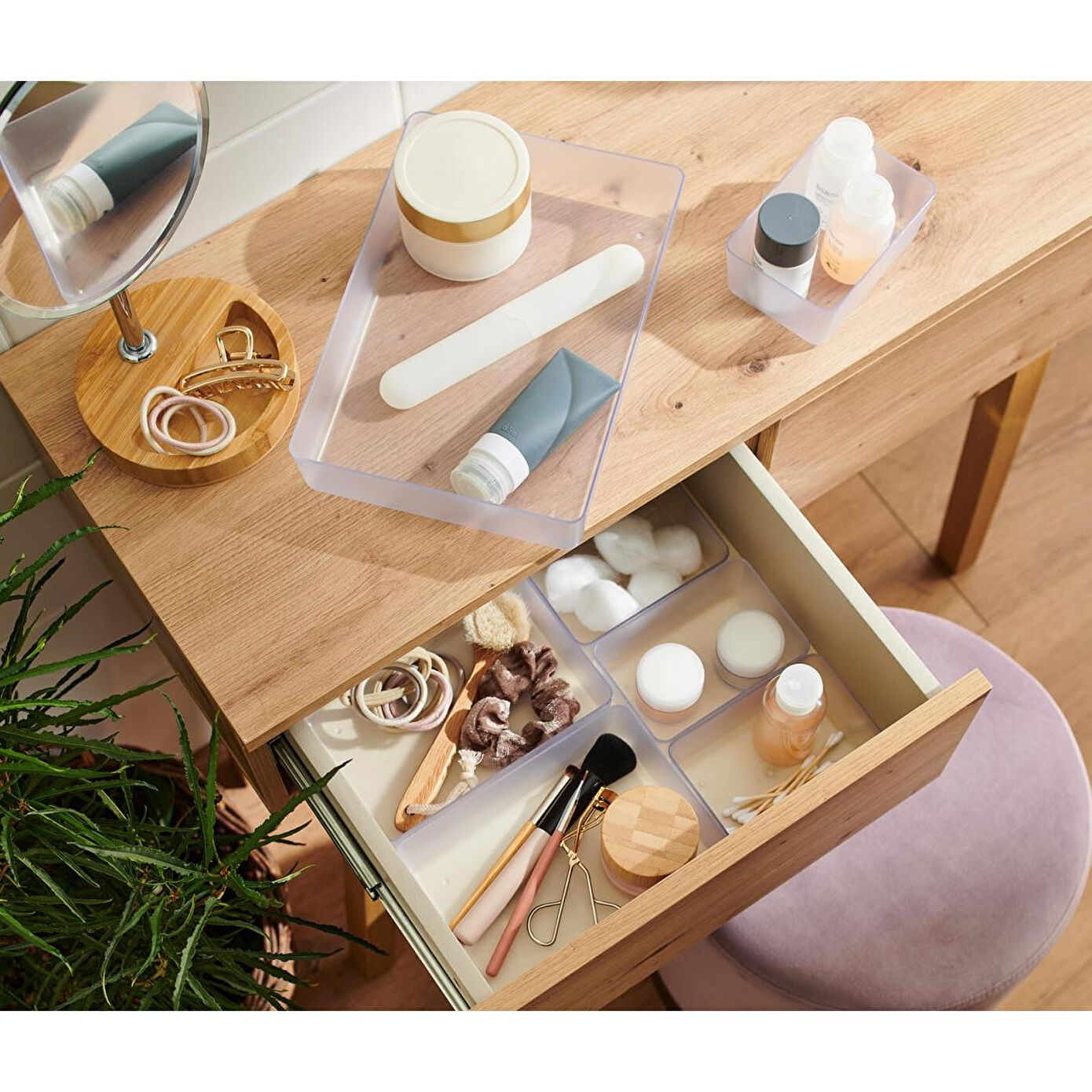 Çekmece Düzenleyici Seti Renk: Buzlu Şeffaf Malzeme: %100 ABS (geri dönüştürülmüş) Ölçüler: G x Y x D 1x yakl.; 26,5 x 5 x 18,5 cm, 2x yakl.; 18 x 5 x 13 cm, 4x yakl.; 12,5 x 5 x 8,5 cmMalzeme kalınlığı yakl.; 2 mm Ağırlık: Toplam yakl.; 560 g Kullanım Uyarıları: Elde temizlenir 3 farklı boyda 7 saklama kutusu|Daha fazla düzen, az yer kaplar, daha iyi görünürlük|Çok yönlü kullanılabilir, örn.; banyoda, büroda veya mutfakta|Geri dönüştürülmüş malzemeden|Bu düzenleyici set kaynakları korur.