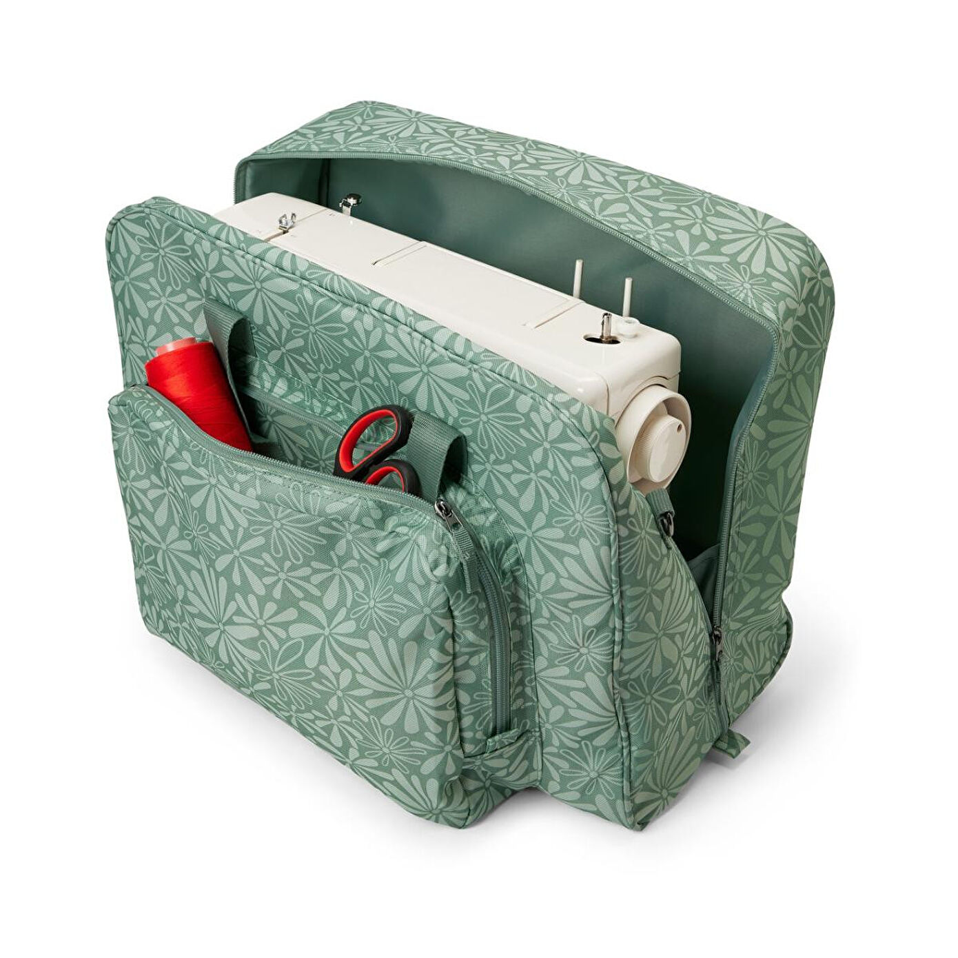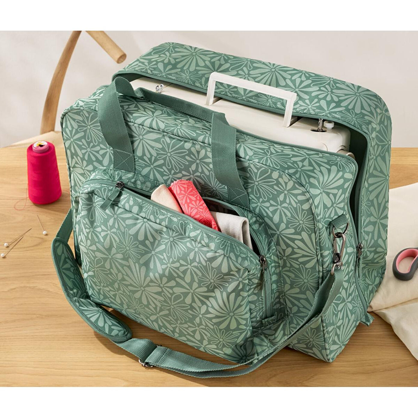 Konforlu taşıma ve korumalı saklama Kolay saklamak ve çıkarmak için geniş açılan 2 yönlü fermuar Yaygın olarak kullanılan tüm dikiş ve Overlock makineleri ile uyumlu Cırtcırtlı 2 taşıma sapı ve ayarlanabilir, çıkarılabilir omuz askısı: Uzunluğu yakl. 130 cm Dikiş malzemeleri için büyük ilave fermuarlı bölme Arka kısımda 2 cep 5 adet plastik ayak Zararlı madde kontrolü yapılmıştır – harici, akredite kuruluşlar tarafından İçerik Renk Adaçayı rengi ve koyu adaçayı rengi Malzeme Dış malzeme ve astar %100 polyester İç kaplama %100 PVC Fermuar poliamit Karabina metal Ayaklar plastik Ölçüler G x Y x D yakl. 45 x 37 x 16 cm Omuz askısının uzunluğu yakl. 130 cm, dolgu yakl. 22 x 7 cm Taşıma Kuvveti Maks. 10 kg