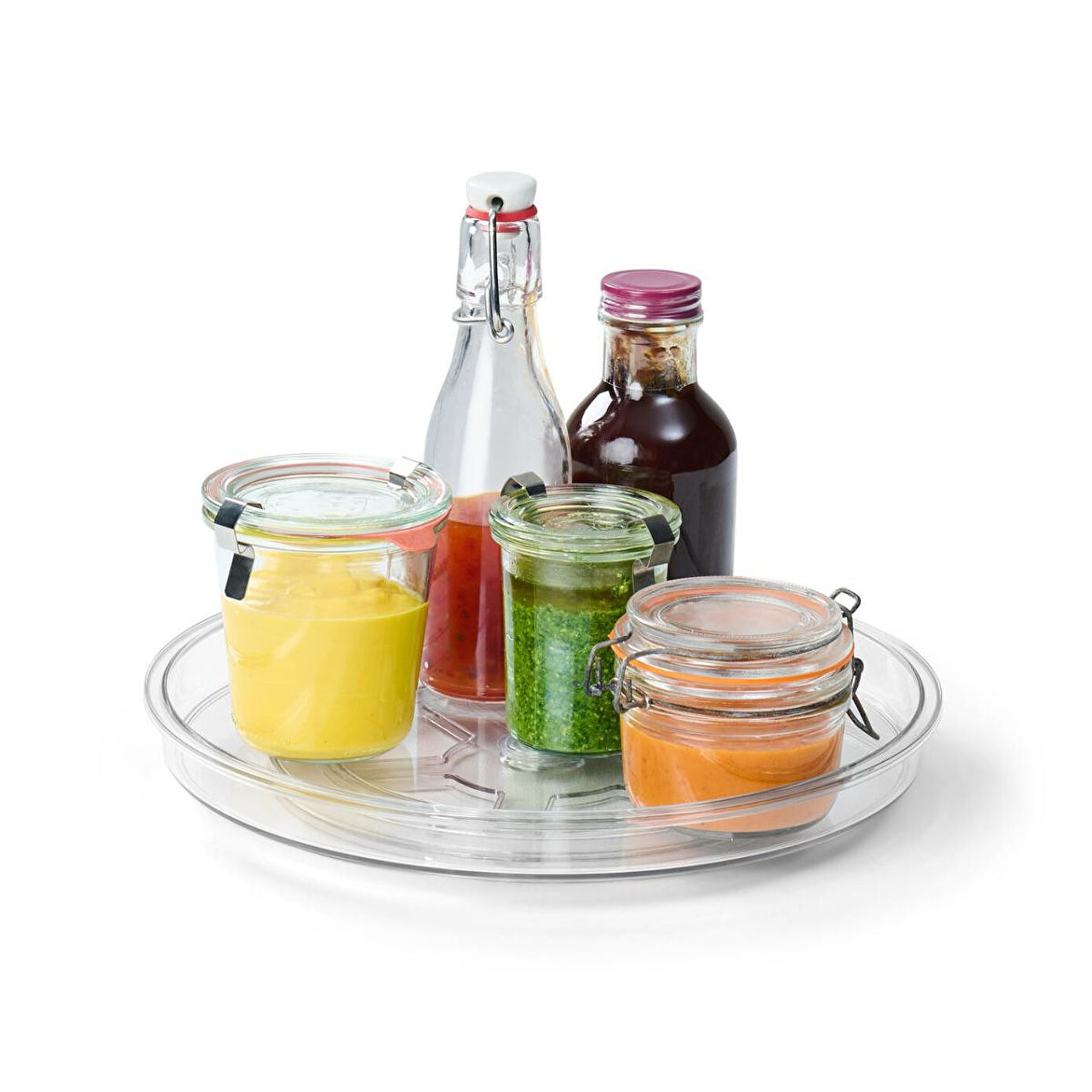 Döner Tabla, Saydam Dolap ve buzdolabında düzensizliğe son Mutfak dolapları ve kilerler için de uygundur En iyi görüş için 360° döndürülebilir Şık görünüm Silikon kaydırmaz ayakları sayesinde maksimum sağlam duruş Zararlı madde kontrolü yapılmıştır – harici, akredite kuruluşlar tarafından Renk Saydam Malzeme Döner tabla, taban plakası ve döner çember %100 polietilen tereftalat Bilyeli rulman paslanmaz çelik ve polipropilen Kaydırmaz ayaklar %100 silikon Ölçüler Dış çapı yakl. 28,5 cm İç çapı yakl. 27 cm Yüksekliği yakl. 3,5 cm Taşıma Kuvveti Maks. 7 kg