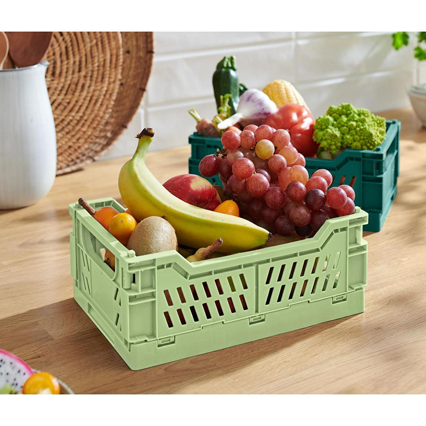 2 Adet Katlanabilir Düzenleyici Sandık Renk: 1 adet açık yeşil, 1 adet petrol rengi Malzeme: %100 polipropilen Ölçüler: G x Y x D yakl. 25,5 x 10,5 x 16,5 cm Ağırlık: Her biri yakl. 200 g Taşıma Kuvveti: Her biri maks. 1 kg Kullanım Uyarıları: Sandıklar istiflenebilir ve yerden tasarruf etmek için katlanabilirSadece kuru gıdalar için uygundur Mutfak malzemelerini, ev eşyaları veya ofis gereçlerini muhafaza etmek için idealdir |Katlanabilir|Çok yönlü kullanılabilir
