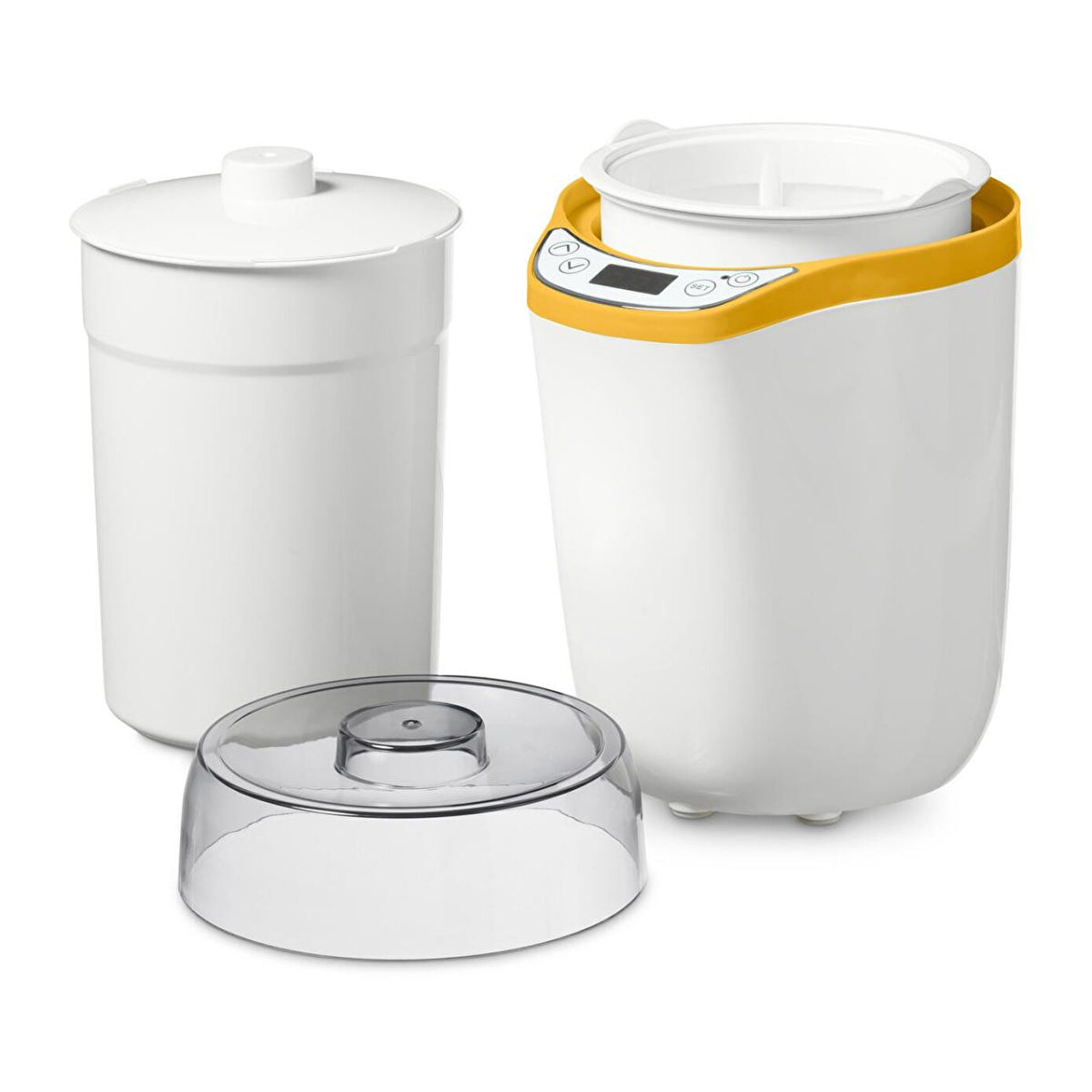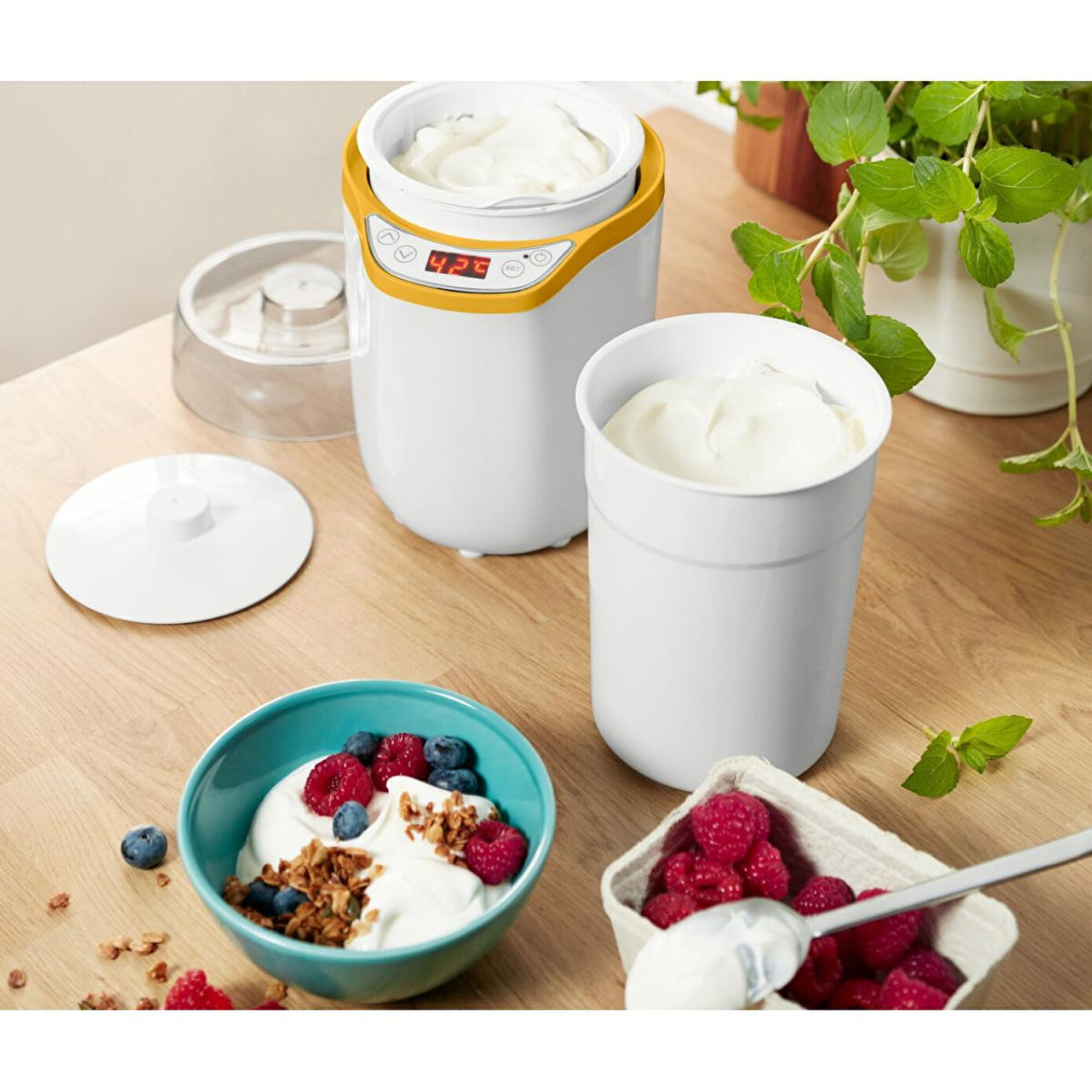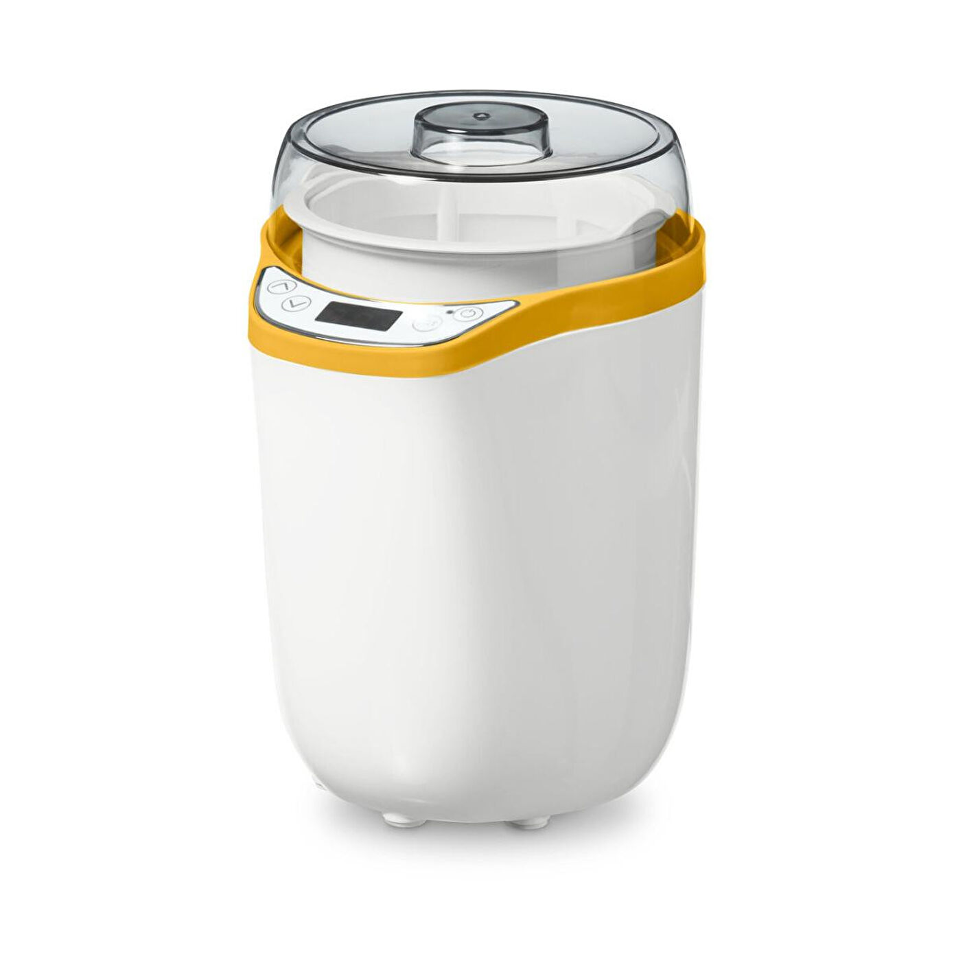 Ev yapımı vegan/laktozsuz yoğurt ve krem peynir yapımı için de uygundur Önceden ayarlanabilen 4 program: Doğal yoğurt, vegan/laktozsuz yoğurt, krem peynir, yeşillik özü – manuel zaman ve sıcaklık ayarı 2 adet ekstra büyük kap – 1,5 l ve 1,8 l Kalan süre göstergeli LED ekran Zararlı madde kontrolü yapılmıştır – harici, akredite kuruluşlar tarafından İçerik Renk Beyaz ve sarı Malzeme %100 polipropilen Ölçüler G x Y x D yakl. 18 x 23 x 15,5 cm Kablo uzunluğu yakl. 100 cm İçerik Kapaklı 1,8 l kap, 1,5 l kap, filtre sepeti, tarif önerisi ve kullanım talimatları dahildir Dolum kapasitesi 1 adet yakl. 1,8 l 1 adet yakl. 1,5 l Güç 25 W 230 V/50 Hz Teknik Detaylar Yoğurt ve krem peynir makinesi 10 °C ila 60 °C arası sıcaklık için uygundur, kaplar 0 °C ila 40 °C arası sıcaklık için uygundur