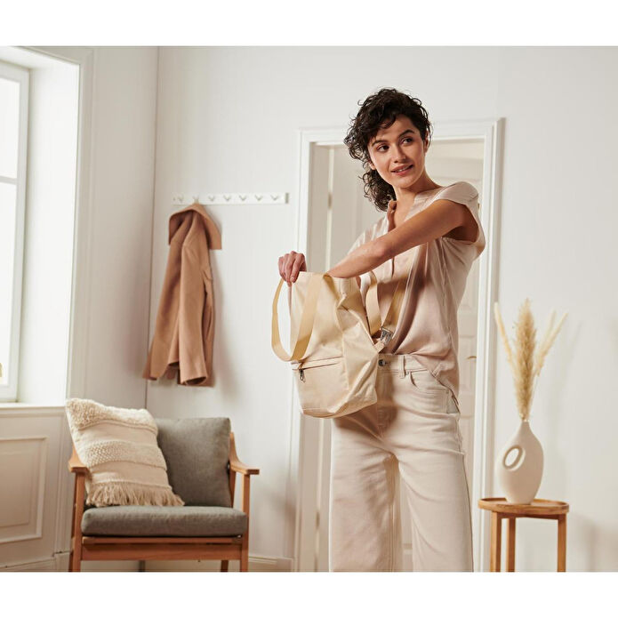 Emniyetli Omuz Çantası Renk: Bej rengi Malzeme: Dış malzeme ve astar poliüretan kaplamalı %100 polyester (geri dönüştürülmüş), su tutmazKemer bantları ve elastik bant polyesterOmuz kemeri kesilmeyen telli polyesterFile iç çanta %100 polyester (geri dönüştürülmüş)Kıskaçlı kanca ve fermuar metalKlipsli kilit plastik Ölçüler: G x Y x D yakl.; 30 x 36 x 10 cmG x Y x D omuz kemersiz katlı halde yakl.; 30 x 15 x 10 cmOmuz kemeriyle yükseklik yakl.; 80 cmÖn cep yakl.; 28 x 9 cmİç cep yakl.; 28 x 32 cmOmuz kemerinin yüksekliği yakl.; 28 cm, genişlik yakl.; 3,5 cmBel kemerinin uzunluğu yakl.; 85 – 105 cm arası ayarlanabilir İçerik/Aksesuar: Çıkartılabilir bel kemeri dahildir Taşıma Kuvveti: Maks.; 5 kg Omuz ve bel çantası olarak kullanılabilir|Üst kısmı kompakt şekilde rulo yapılabilir ve sabitlenir|Metalle güçlendirilmiş bel kemeri – koparılmasını zorlaştırır|Dayanıklı ve su tutmayan üst malzeme|Önde ve içte birer fermuar|Geri dönüştürülmüş malzemeli|Omuz çantası 15 adete kadar PET şişeden oluşmuştur.; *|*Kaynak: Textile Exchange baz alınarak yapılan kendi hesaplamamız / ortalama değer