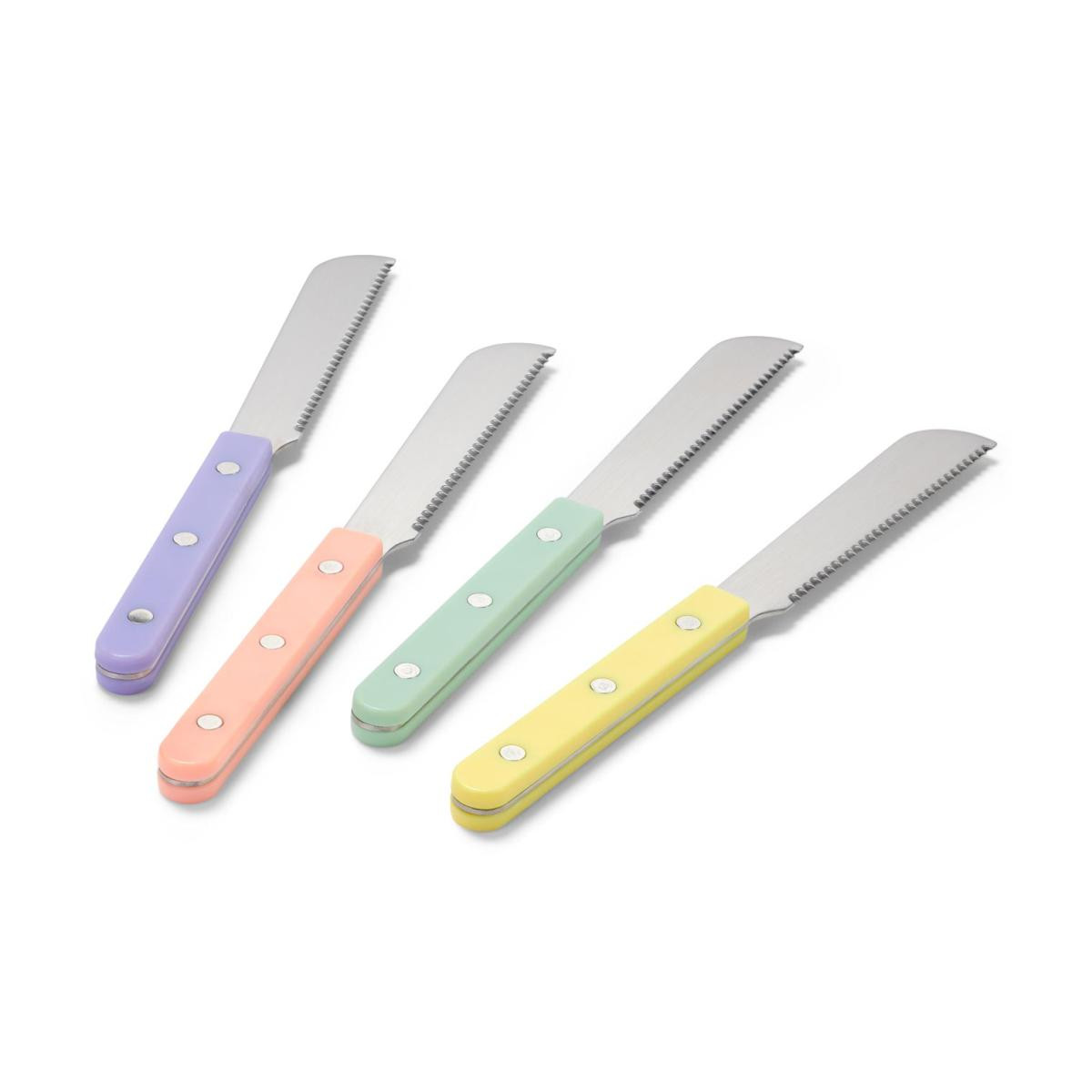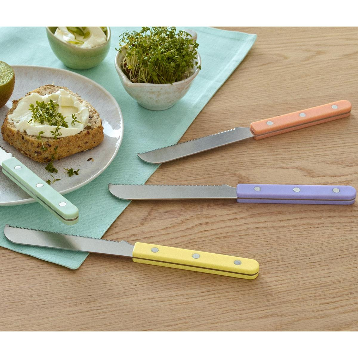 4 Adet Kahvaltı Bıçağı Renk: Gümüş renkli bıçaklarSaplar 1 adet adaçayı rengi, 1 adet leylak, 1 adet sarı, 1 adet kayısı rengi Malzeme: Bıçaklar paslanmaz çelikSaplar ABSPerçinler 18/10 paslanmaz çelik Ölçüler: Uzunluğu yakl.; 21,5 cmYüzünün uzunluğu yakl.; 11 cm İçerik/Aksesuar: Kullanma kılavuzu dahildir Unlu mamulleri kolayca kesmek için tırtıklı yüzü olan geniş uçlu bıçak|Bıçaklar paslanmaz çelikten|Bulaşık makinesinde yıkanabilir