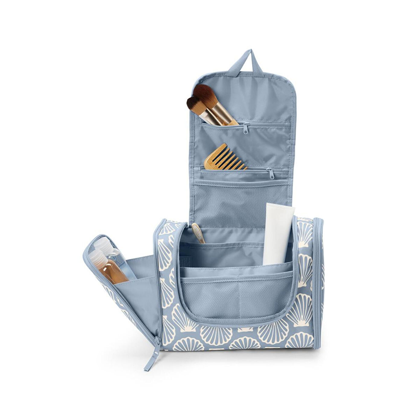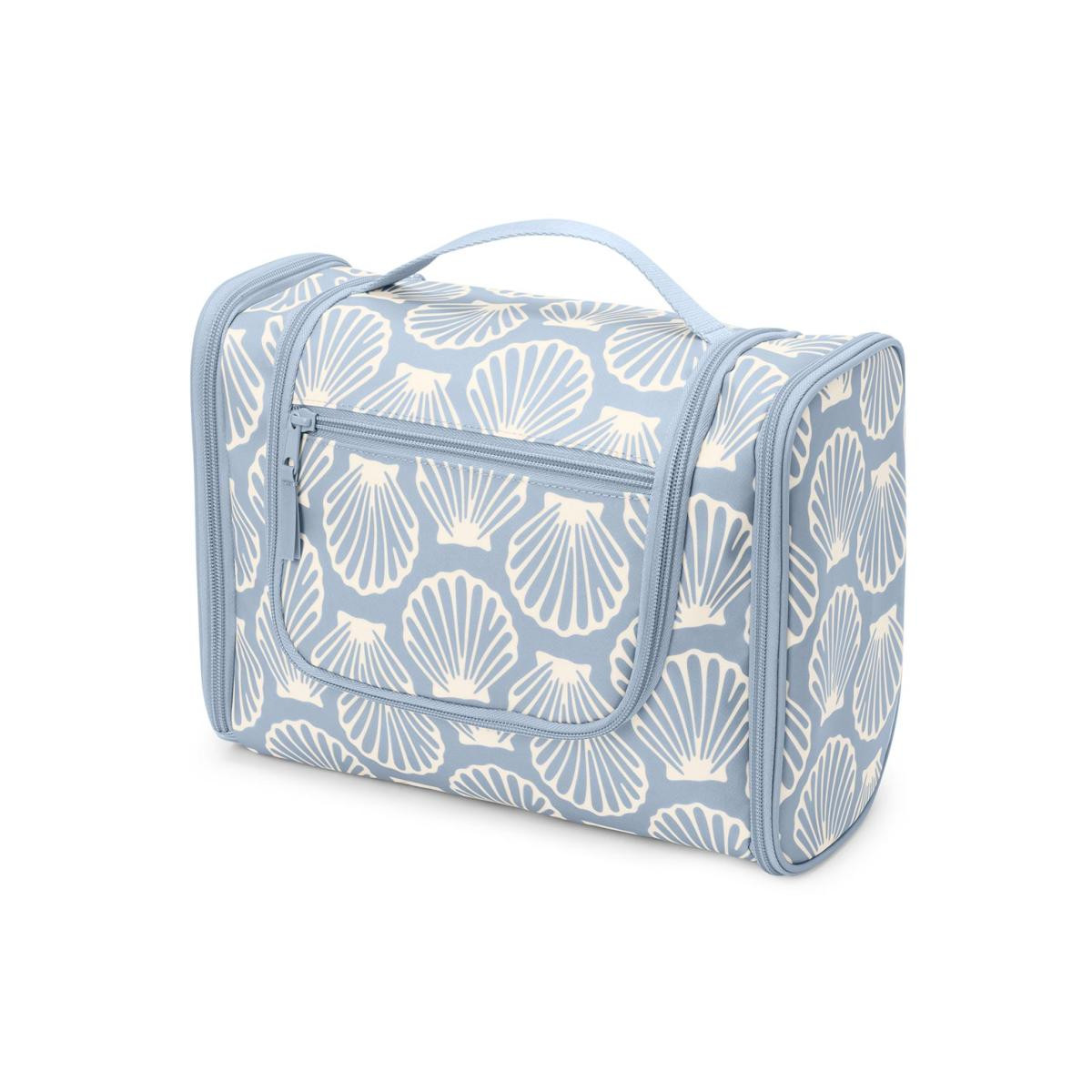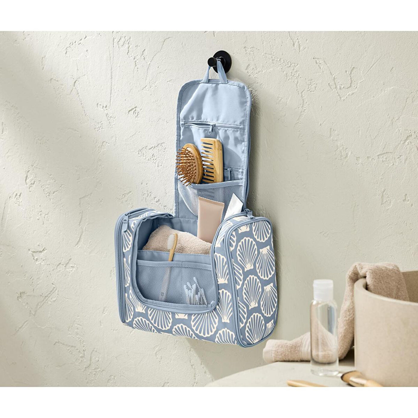 Kişisel Bakım Çantası Renk: Tamamı krem beyaz baskılı açık mavi Malzeme: %100 polyesterKaplama %100 termoplastik elastomerFermuar poliamid ve metal Ölçüler: G x Y x D yakl.; 29 x 21 x 12 cm Eşya koymak için birçok göz içerir|Dayanıklı, silinebilir malzeme|Taşıma saplı|Dışında çeşitli fermuarlı bölmeler|İç kısmında 2 adet fermuarlı bölme ve kozmetik ürünleri için ekstra bölmeler|Asılabilir|Ek saklama alanı için 2 büyük yan cep|Tamamı midye baskılı