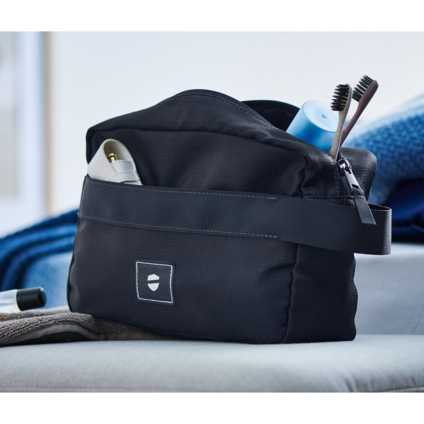 Kişisel Bakım Çantası, Mavi Renk: Mavi Malzeme: Dış ve iç malzeme %100 polyester (geri dönüştürülmüş)Fermuarlar poliamit ve metal Ölçüler: G x Y x D yakl. 24 x 16 x 8 cmG x Y ön cep yakl. 23 x 10 cm, iç cep yakl. 22 x 10 cmG x U kulakçık yakl. 4 x 8 cm Geri dönüştürülmüş malzemeden dayanıklı kumaş|Fermuarlı geniş ana bölme|Fermuarlı gizli yan cep|Asılabilir ve taşıma saplıdır|Bu bakım çantası oyuncak plastik atık içerir.
