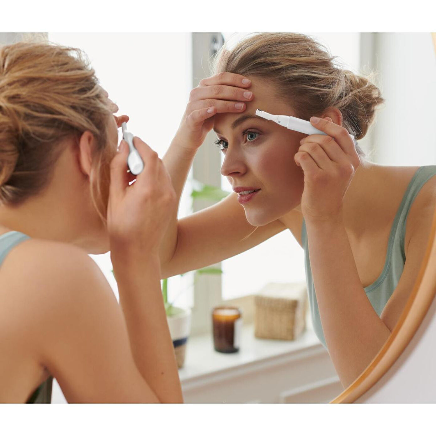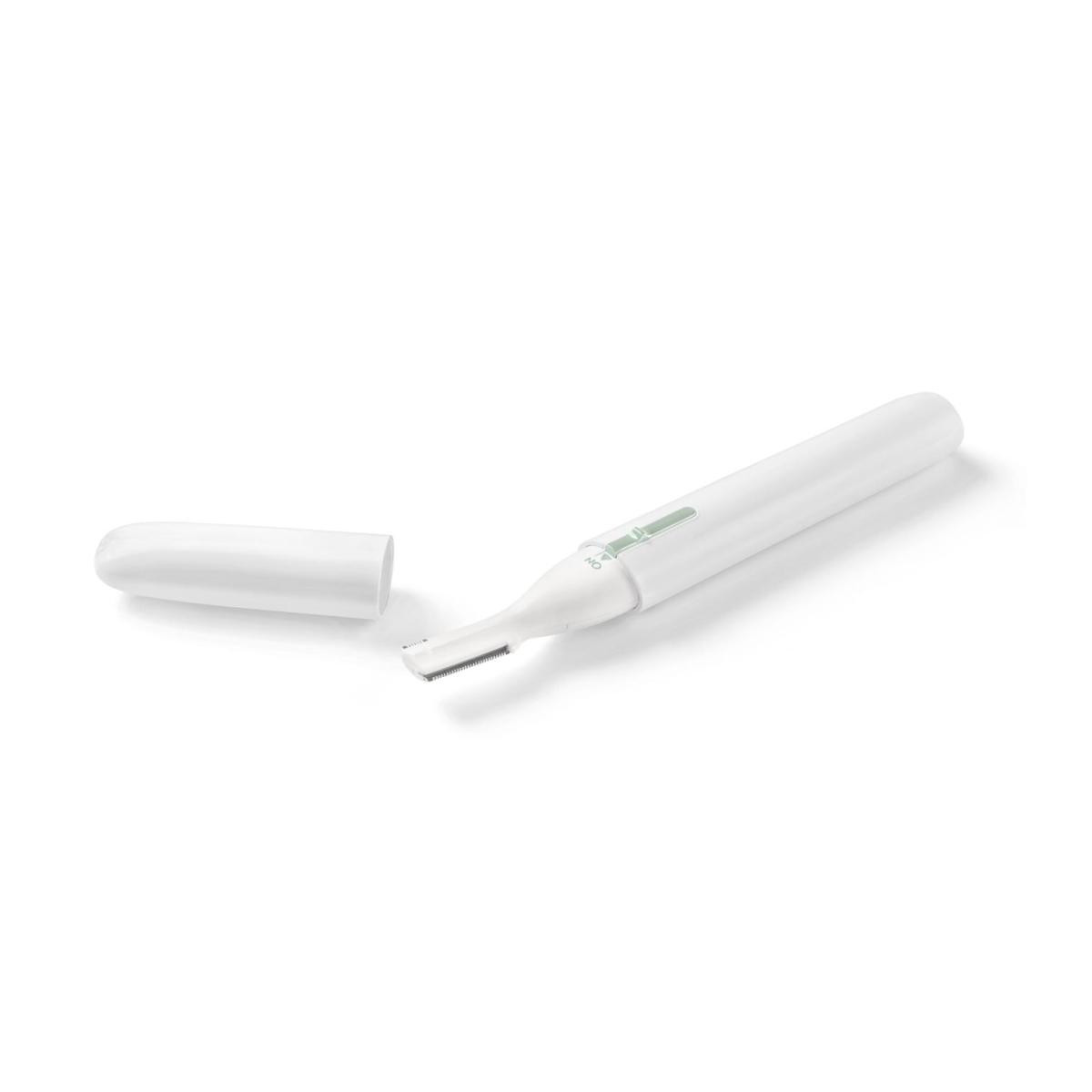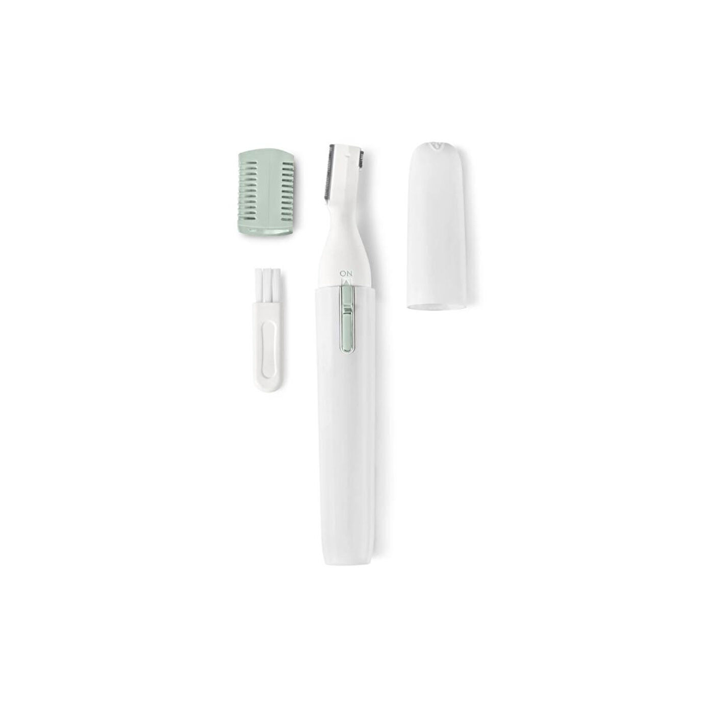 Elektrikli Kozmetik Tıraş Makinesi Renk: Mat beyaz ve adaçayı yeşili Malzeme: Bıçaklar paslanmaz çelik Ölçüler: Uzunluğu yakl. 13 cmÇapı yakl. 14 mm İçerik/Aksesuar: LR03 (AAA) pil, temizleme fırçası, koruyucu kapak, düzeltme başlığı ve kullanma kılavuzu dahildir Ağırlık: Yakl. 16,5 g Teknik Detaylar: Gerilim: 1,5 V/DCSes şiddeti: yakl. 75 dbA Yüz ve boyun kıllarını kolayca gidermek için|Farklı bıçak uzunluklarına sahip 2 yüzey: 6 ve 17 mm|Tüyleri 3 veya 6 mm kısaltmak için ek tarak başlığı|Kolay kullanım – hızlı düzeltmeler için ideal|Pille çalışır – yolculukta kullanmak için de uygundur|Kaşlar, kulaklar veya bikini bölgesi için de uygundur|Yüksek kaliteli alüminyum gövde
