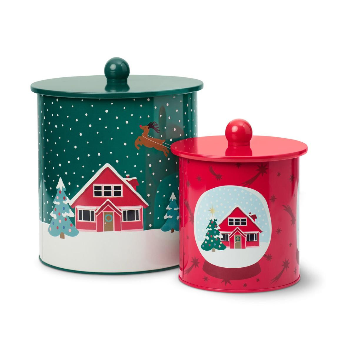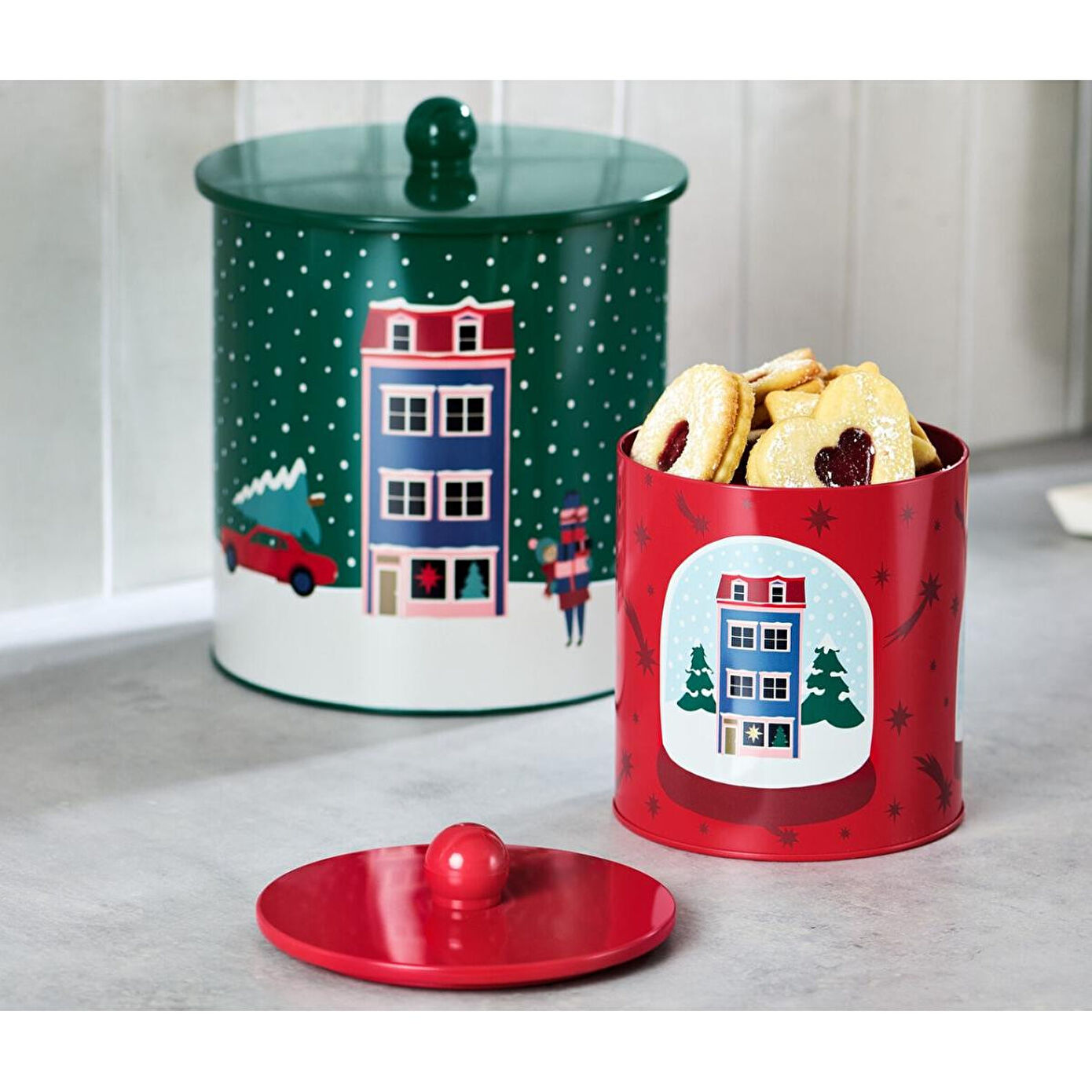 2 Adet Kurabiye Kutusu Renk: 1 adet kış motifli koyu yeşil, 1 adet Noel motifli kırmızı Malzeme: Teneke, baskılı Ölçüler: Büyük kutu çapı yakl. 17 cm, yüksekliği yakl. 18 cmKüçük kutu çapı yakl. 12,5 cm, yüksekliği yakl. 12,5 cm Kurabiyeler daha uzun süre taze kalır|Noel motifli|Kullanılmadığında iç içe konularak yer kaplamadan saklanabilir|2 farklı ebattan oluşan set