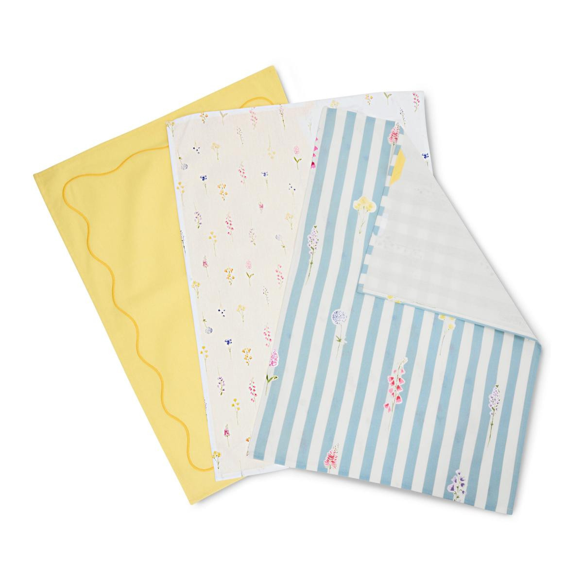 1 adet açık mavi-beyaz çizgili çiçek baskılı, 1 adet beyaz çiçek baskılı, 1 adet dalgalı nakışlı çerçeve ile sarı